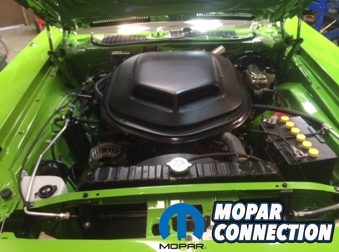 Since Rich had restored all of the components over the cold winter months, the car came together pretty quickly once it was painted. On the inside, brand new Legendary interior was installed. In the engine compartment, Rich rebuilt the 340 engine he had installed for his friend many years prior and located a correct intake, exhaust manifolds and Thermoquad carburetor. Since Rich loves to drive his cars, he installed a Tremec five-speed transmission with a hydraulic clutch. For creature comforts, he re-installed the factory A/C system using a modern Sanden A/C compressor that fit nicely under the shaker hood bubble.