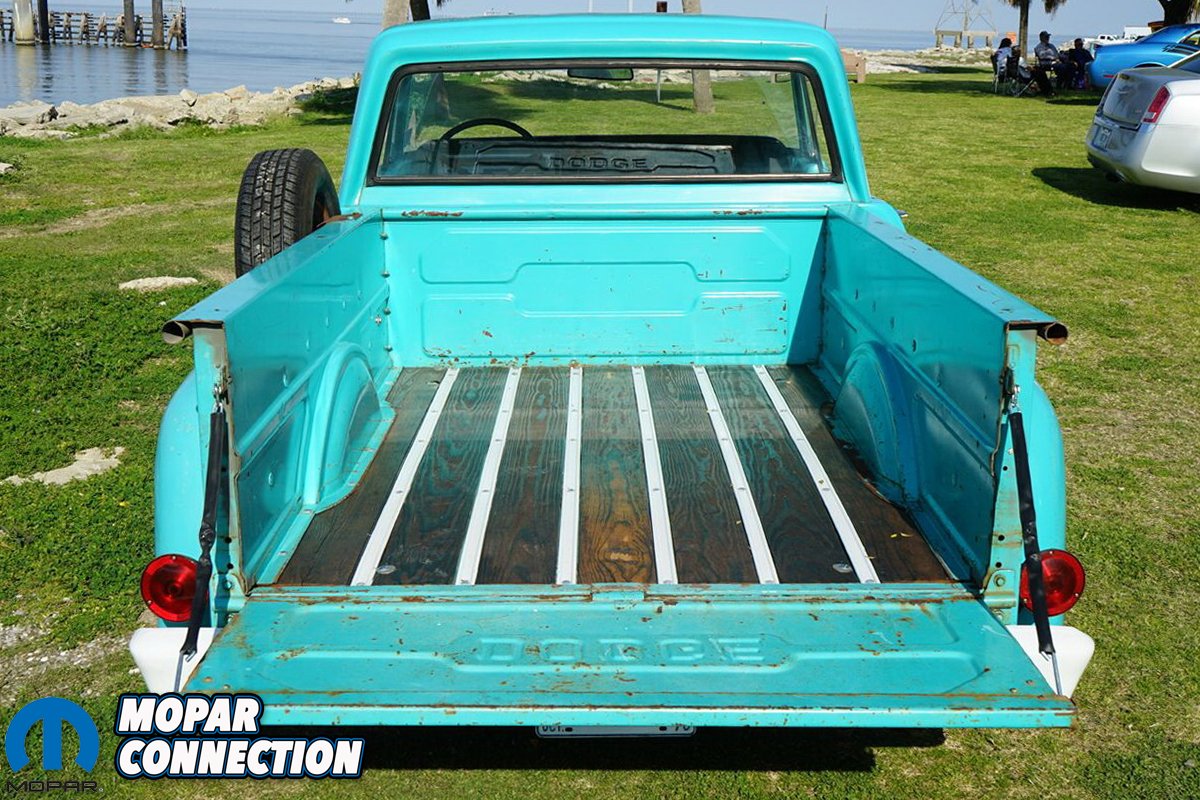 On the exterior, Chris wanted to keep the truck as original as possible so the original bed was cut down to short wheelbase specifications as well as the original bed wood and steps. The only parts replaced in the bed were the divider strips and hardware. Chris is proud to say his truck still retains its original sheet metal which is quite uncommon these days. To keep with the hot rod look, Chris left the paint alone for a wicked patina look. The D100 rolls on Detroit Steel Wheels painted white as the factory wheels were painted white as well. Upfront, the wheels are 20x8s with a 4.5-inch backspace wrapped in a 245/40R20 tire. The rears are 20x9s with a 3.5-inch backspace and 275/40R20 tires. Chris added the dog dishes to keep a factory look.
