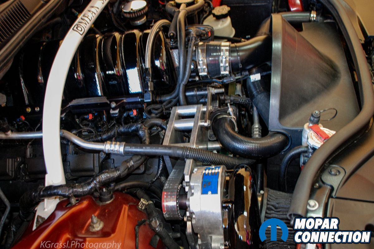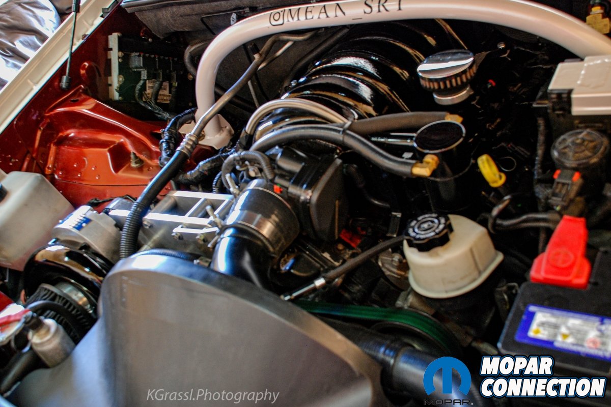 The Jeep’s 6.1L Hemi was upgraded with a fully forged bottom end, Diamond pistons, Molnar rods and a Crower camshaft. The stock cylinder heads came off and a pair of 6.4L Apache heads were installed along with the Vortech V2 supercharger. A Procharger air to air intercooler set up and Flowmaster exhaust were also installed.