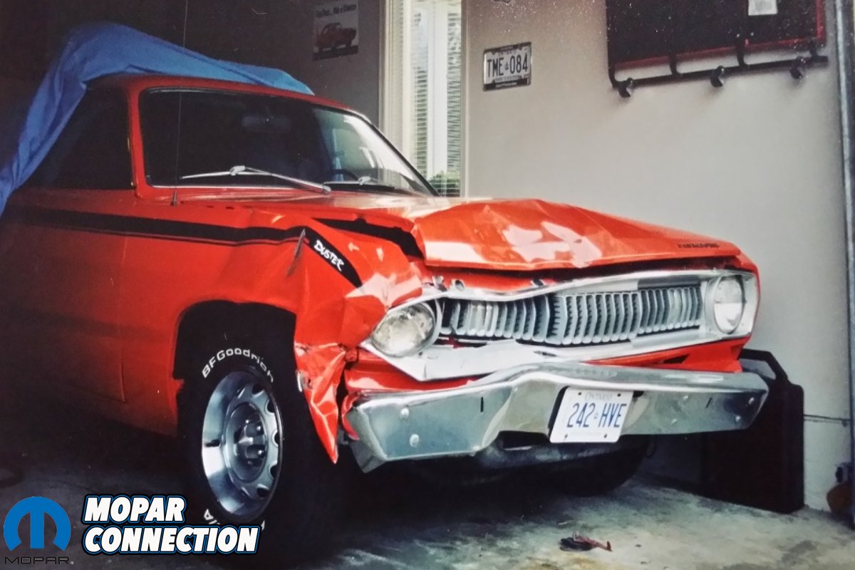 In 2002, Glenn and the Duster had an unfortunate accident. He tells us, “I had a lady pull a U-turn right in front of me and I couldn’t stop in time. I smashed right into her. I was taking my 12 year old son to the doctor because he had sprained his knee. When he got out of the car, he was limping around and the lady felt even worse because she thought she hurt him! I guess she didn’t see the bright orange car?