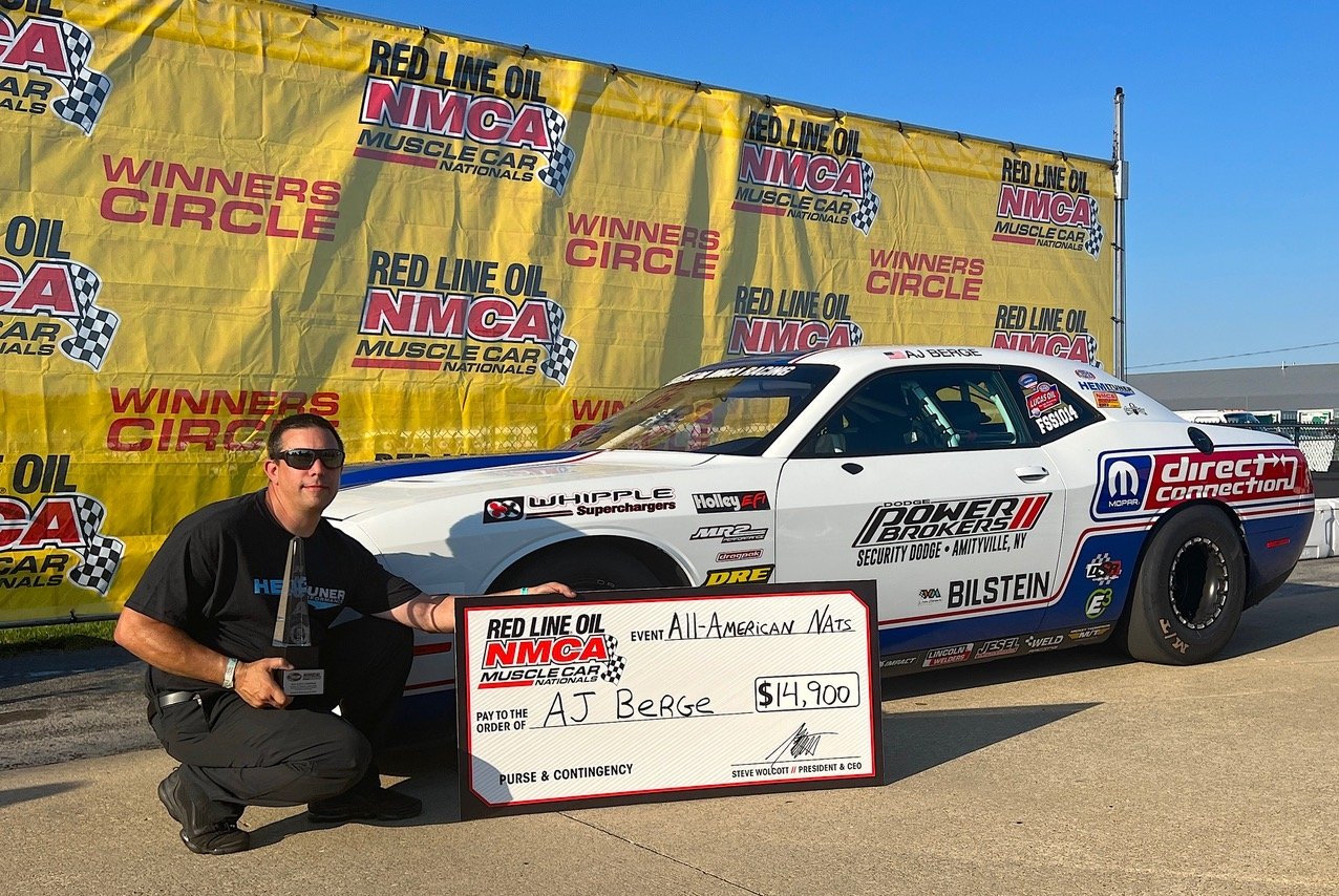 AJ Berge and the HEMI Tuner Performance team had a tremendous weekend at the National Muscle Car Association (NMCA) All-American Nationals, as he took his first series win. Driving his 1,500-horsepower Challenger Drag Pak to victory earned him a cool $10,000 bonus (in addition to the event prize) via the Dodge/Direct Connection contingency program that rewards Drag Pak racers who win at NMCA and NMRA events. Berge’s win also marks the second win for the Challenger Drag Pak in the NMCA Holley EFI Factory Super Car Competition. The original press release (albeit edited for legibility) is posted below: