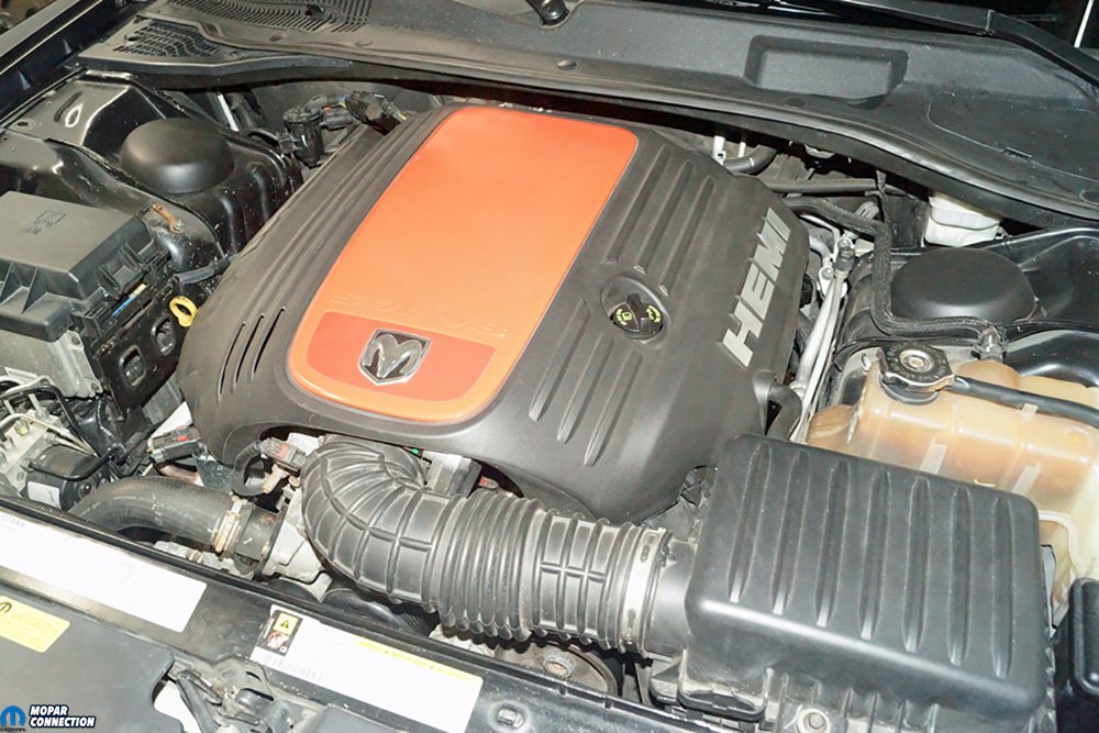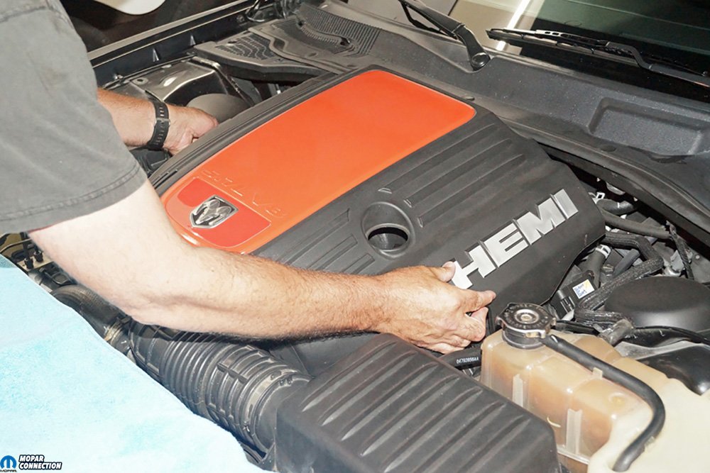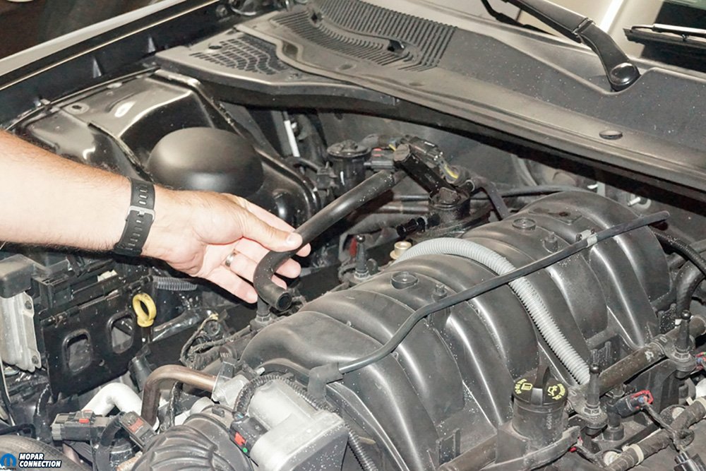 Above Left: Our 5.7L Hemi is a replacement engine with just over 42K-miles on it. The previous Hemi was replaced when the 2006 Police Package Charger was still “Protecting and Serving.” The Charger often sees extended time testing on a Mustang chassis dyno to evaluate new Hemi bolt-on components. Above Right: To install the JLT Performance V3.0 oil separator we picked up from American Muscle, we needed to remove the engine cover to gain access to the Hemi. The cover was quickly removed by pulling upward, which released the four connecting studs.