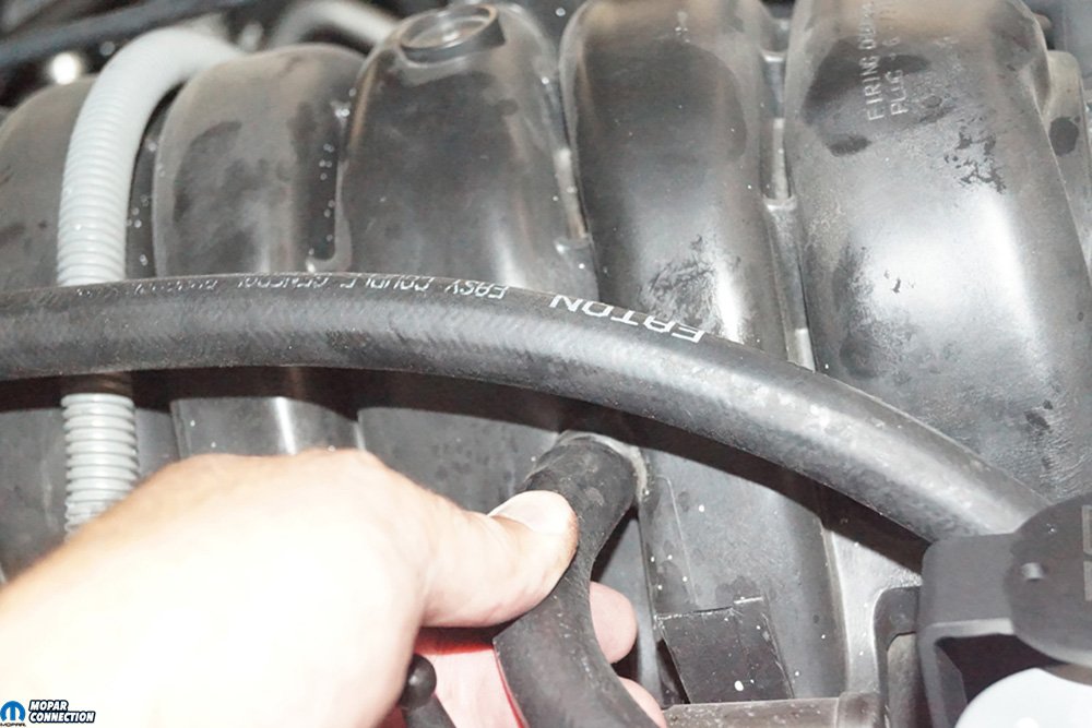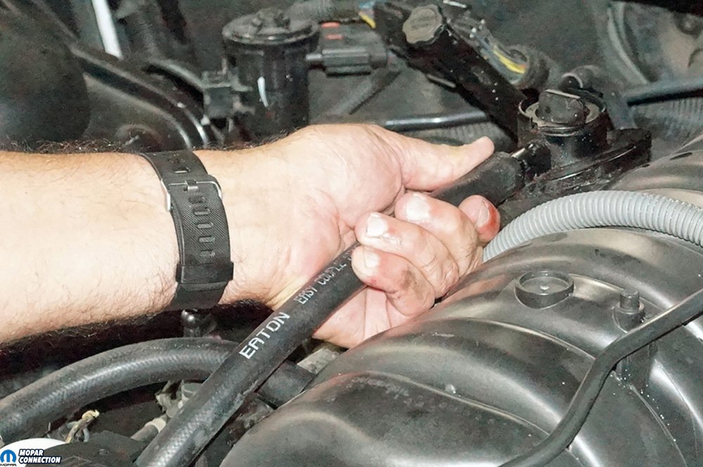 We unthreaded the base cup from the upper housing, and the shorter of the two supplied hoses was slipped onto the left-most 90° fitting on the canister. The long tube was pushed onto the 90° fitting on the right side of the housing (the fitting is at a 45° upward angle compared to the housing top). We applied a light oil to the opposite end of each of the hoses. The lubrication facilitates the installation of the tubes onto the Hemi. Even when properly lubricated, the hoses were a challenge to install. The longer hose was routed to the PCV valve, and the shorter tube was directed to the intake manifold.