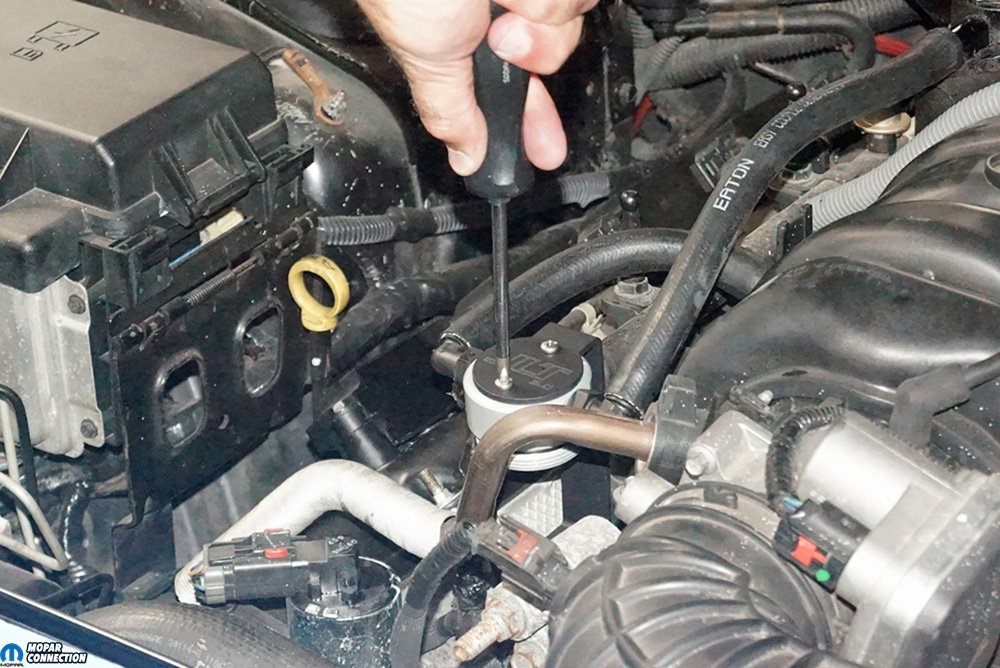 Two small screws were run through the upper bracket support previously installed to the cylinder head. We tightened the screws into the upper housing of the oil separator. To install the base cup, we had to remove the intake air temp (IAT) sensor connector and maneuver the cup under the exhaust gas recirculation (EGR) valve tube. Once the cup was slipped around the EGR tube, we threaded the base cup onto the housing, reattached the IAT connector, and fitted the engine cover back onto the Hemi.
