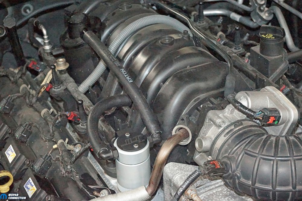 Recently, while removing the intake manifold to install a component, we noticed a trace of oil dripping from two of the intake runners nearest the hose that extended from the positive crankcase ventilation valve (PCV). To reduce the oil and other debris entering the manifold, we reached out to American Muscle for an oil separator recommendation. The reps suggested a JLT Performance V3.0 oil separator, which fits the 2005-2020 5.7L Hemi in the Charger, Challenger, and 300, and mounts on the Magnum 2005-2010 5.7L engines. We had a choice of a black or satin anodized finish on the oil canister; we selected the satin finish.