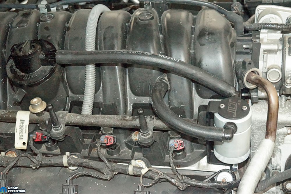 Our concern with the Hemi, which endures plenty of rpm when testing products on the chassis dyno, is it experiences a bit of oil entering the intake manifold during the back-to-back-to-back wide-open-throttle (WOT) runs. With an oil separator fitted between the PCV valve outlet and the inlet to the intake manifold, the separator should capture much of the oil and debris before polluting the Hemi’s intake air/fuel charge and reducing the engine’s performance.