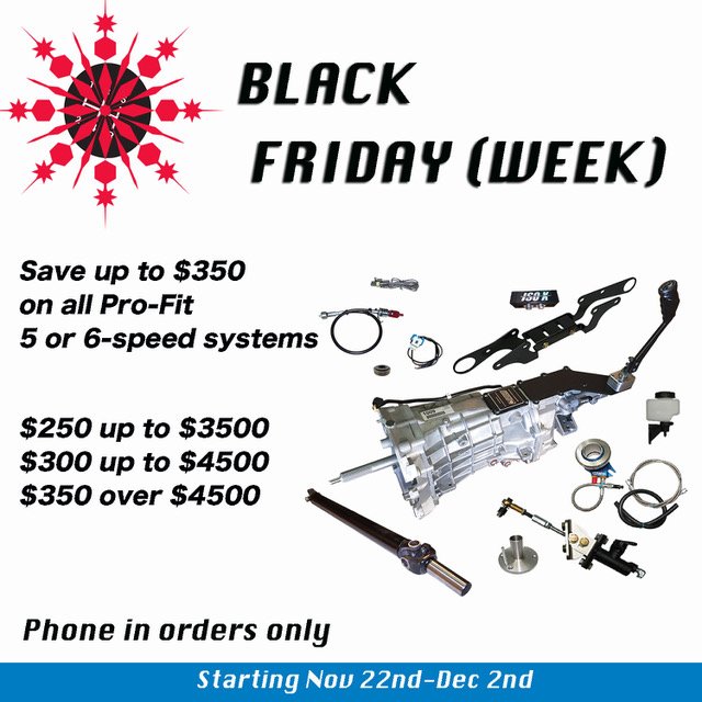 That’s right, you can save up to $350 on all Pro-Fit 5- and 6-speed systems. Let’s break it down: You’ll save $350 when you spend over $4,500, $300 when you spend up to $4,500, or $250 when you spend up to $3,500. It’s really that simple. There’s no coupon code or secret password to use either, just call (the offer is for phone-in orders only) between November 22nd and December 2nd, and prepare to save on your new Pro-Fit kit!