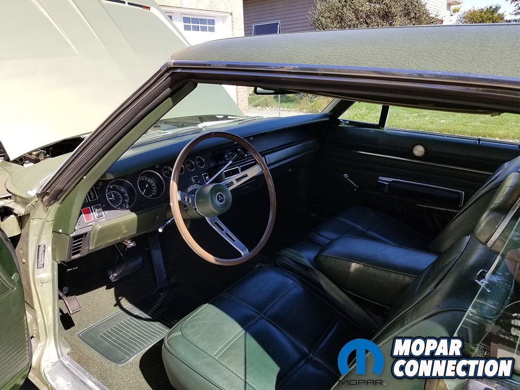 During the restoration, some sheet metal replacement was done to replace some of the weathered and rusted spots from its time as a daily driver. Jim tells us that he made sure that body filler use was very minimal. Once the body work was done, the Charger was sanded, primed and repainted a fresh coat of F3 Light Green. The vinyl top, chrome bright work trim and glass are all original as it came from the factory in 1969.