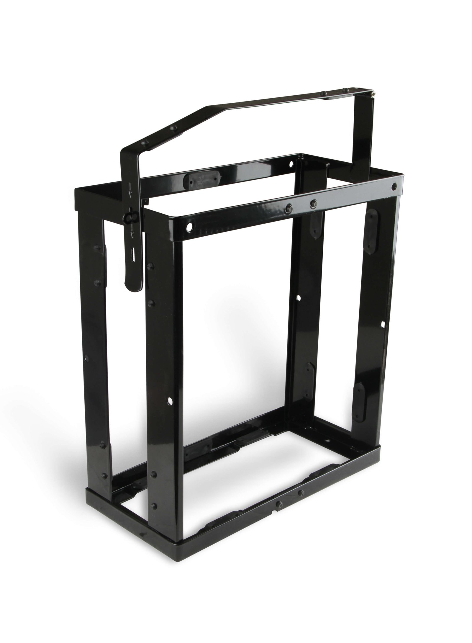 Above left: The jerry cans are 9/10 mm thick pickled steel metal and are EPA and CARB EO #G-14-079 approved for sale and use in all 50 states. Above middle: The Anvil Off-Road Metal Mounting System designed for the jerry cans is constructed from heavy gauge steel and is painted black. Above right: The Metal Mounting System can be bolted or welded to your Jeep, and it has provisions for a padlock to secure the jerry can.