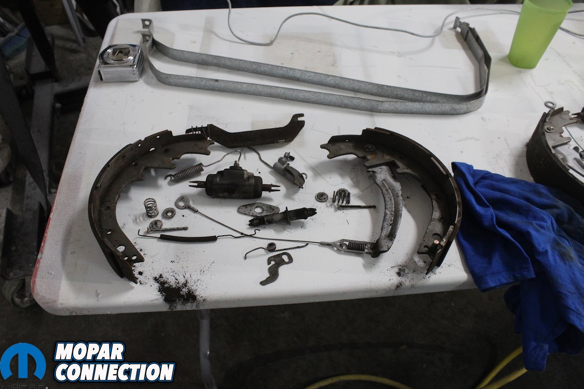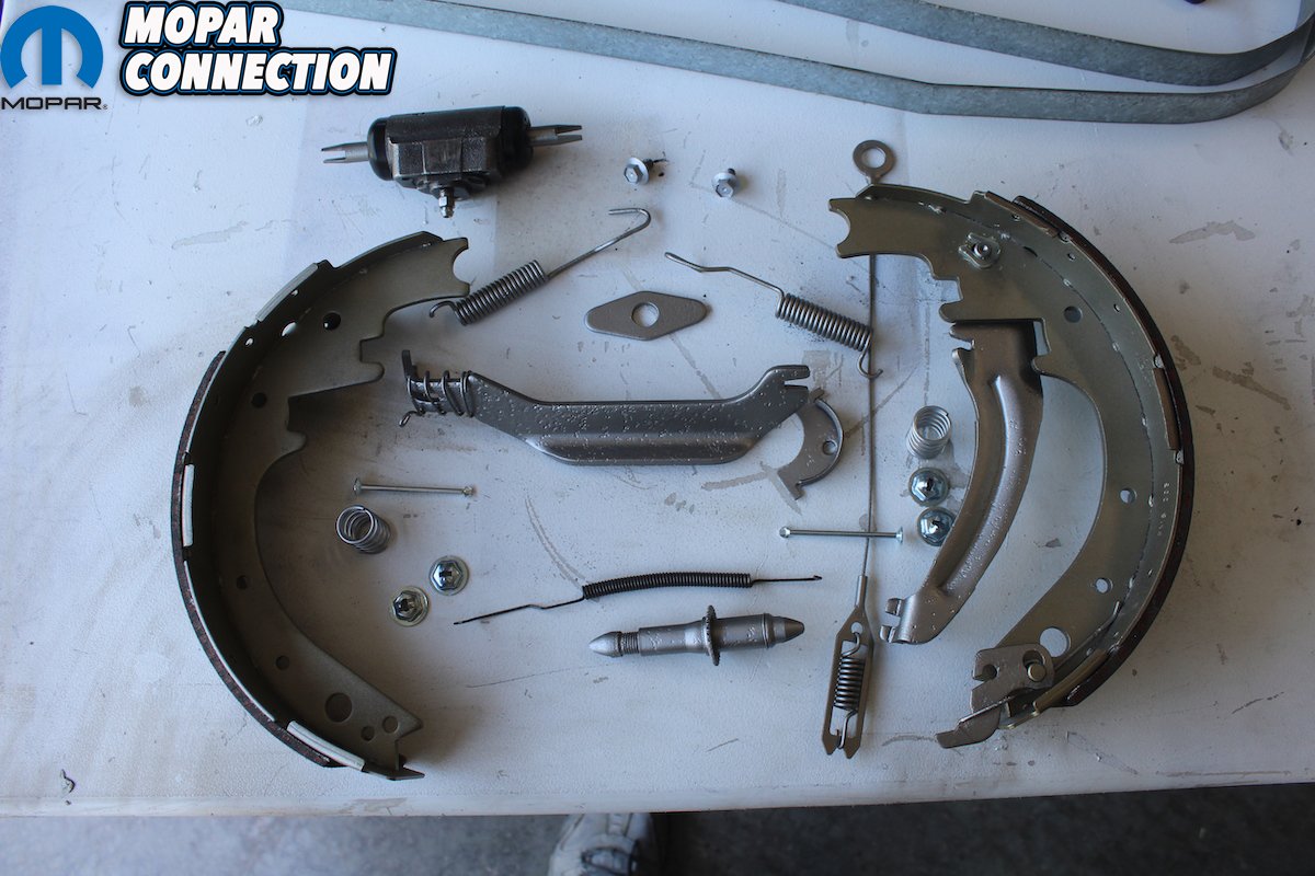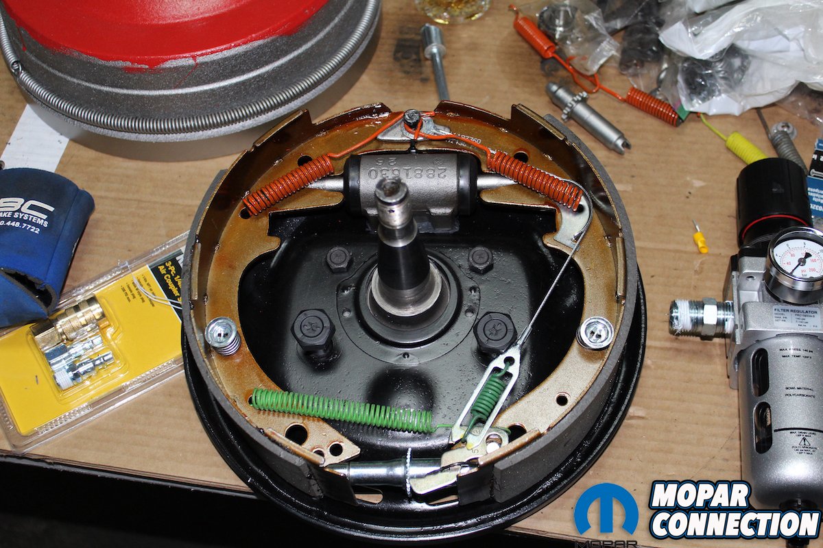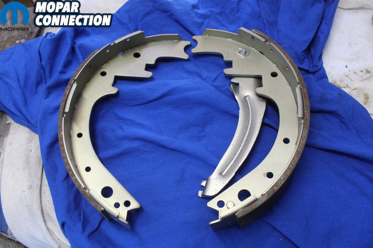 Above left: Out of these parts from the “Comeback ‘Cuda” we were able to restore and use them all except for the brake shoes and guts of the wheel cylinders. We also replaced the springs and keepers for the brake shoes. We cleaned the rest of the parts with the wire wheel on the bench grinder, and refinished them using the original finishes we found on each of the parts. Above right: We replaced the worn spring adjuster, and any other hardware that was vital to the correct functioning of the brake system. Also remember the star adjuster has a left and a right. You must have the correct one on the correct side for the brake to be adjusted correctly during use.