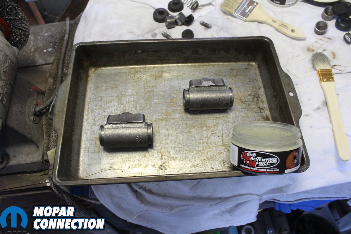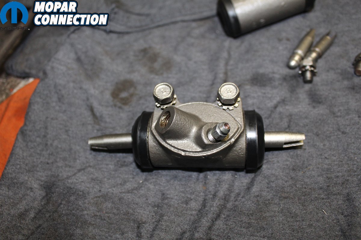 Above left: After cleaning the bores with a hone we replace the entire guts of the wheel cylinder. The last thing you want is to have anything associated with the brake system leak after assembly. Oh, and also it is kind of important for the brakes to work when you have your foot to the floor and need to stop. Above right: Just a heads up. There are several different wheel cylinders that go on these cars. This one has the large 11-inch HD brakes and needs this particular wheel cylinder. Some have a square recess. They have to match your backing plate so pay special attention to your specific application.
