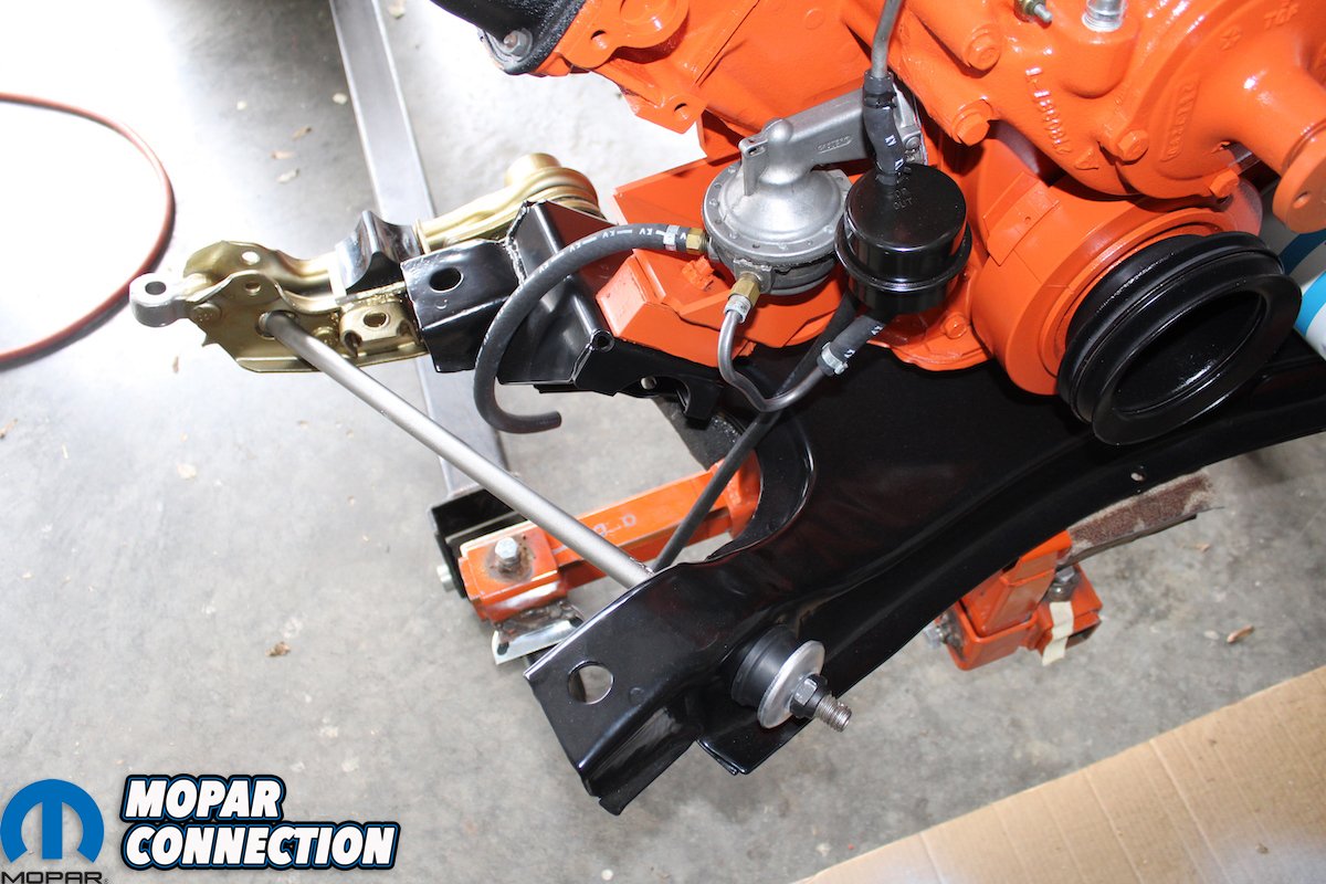 With the engine and Hemi K-member assembled and mounted on the engine dolly that we fabricated, we can now assemble the front suspension right on the stand. By doing this we can install everything in the car at one time from the bottom just like the factory did.