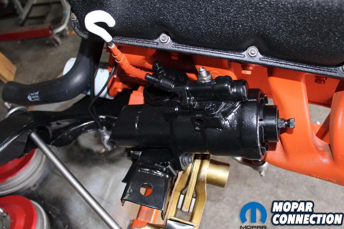Above left: Front strut rod is natural with black phosphate nuts on both ends. Don’t forget the roll pins that go in the front of the rods. The replacement bushings are far from original in shape but are all that are available. Above center: Once installed the lower control arm, strut rod, and bolts look completely original. It is believed that the bump stop on the six pack and Hemi cars had a plate to boost the stop to compensate for the extra heavy load and 15 inch wheels. Above right: We had the original power steering box restored by Steer and Gear. We always go to them because quite frankly there isn’t really too many choices. We upgraded the response of the unit to a firmer feel. They do good work but could stand to be more organized in their communication. Just don’t let them paint your steering box. Most of the paint pealed off before the unit could be used. Paint it yourself.