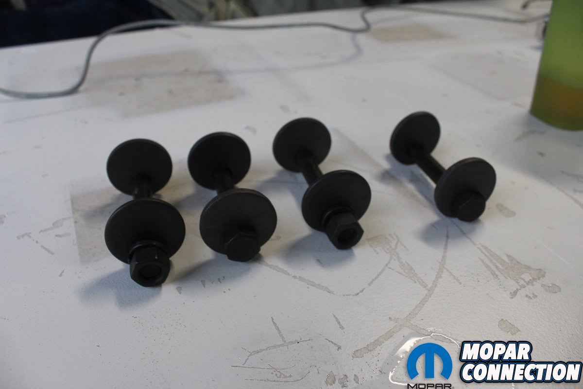 Above left: We purchased the upper control arm bumpers from Frank Badalson and they look and install like the originals. Also notice the correct nuts for this application. Thing is, when installed no one can see the numbers! But that is why you take as many pics as possible. Documentation! Above right: The cam adjustment bolts are finished in black phosphate. There really isn’t any reason to try to restore yours when these completely original repops are available. Just save yourself time and money in the long run. Replace it once with the correct part even if it costs a little more. If you are serious you will replace it later when a good knowledgeable judge calls you out!