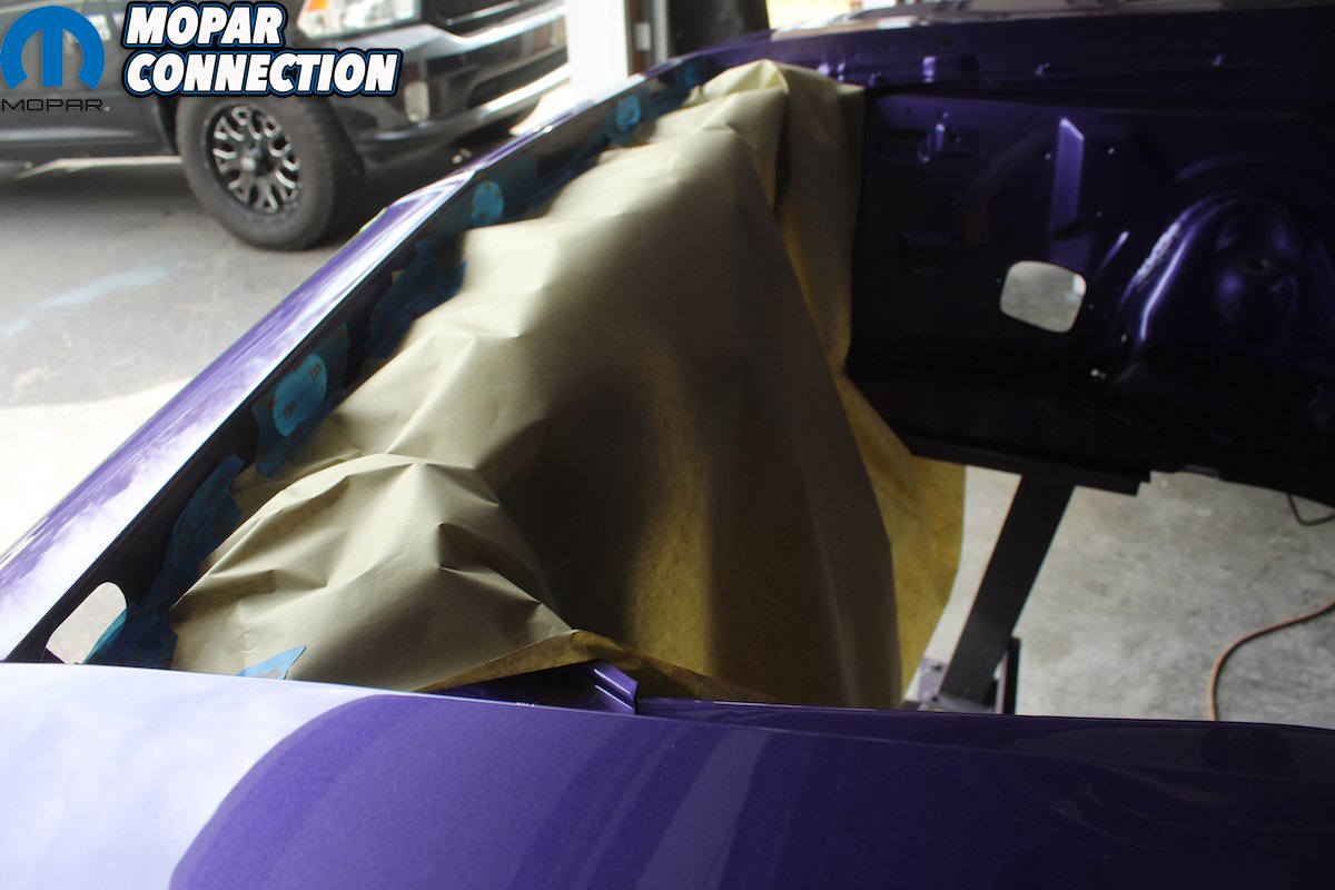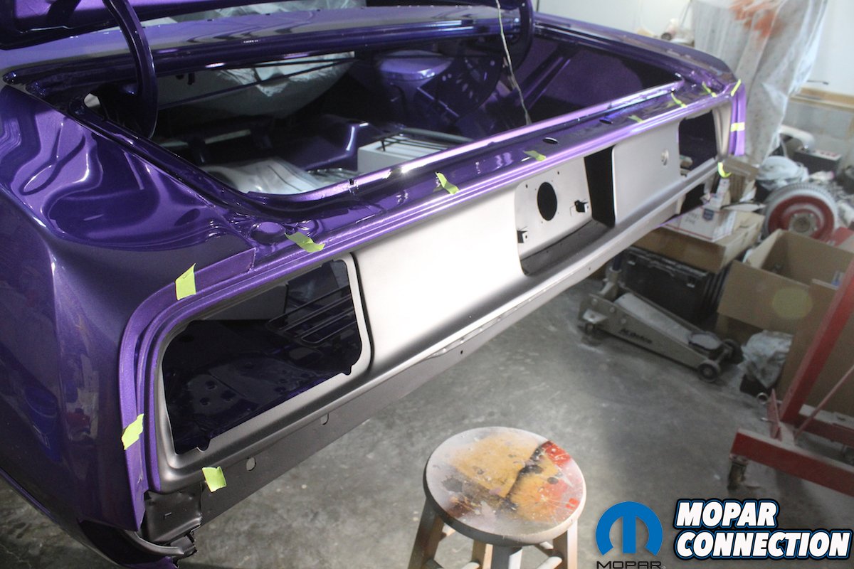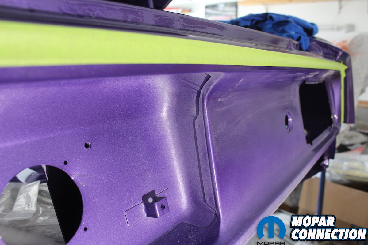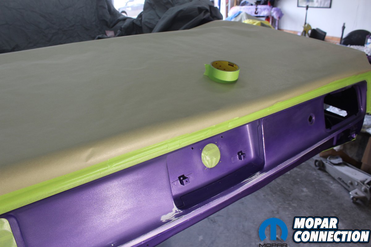 Above left: Shooting this paint really takes some practice. The recess for the tag can get too rough if you don’t pay close attention to the hard to reach areas. Also, the upper curve of the panel can get too thin and rough. Don’t worry. If it turns out too rough, just wet sand it with 600 grit, blow it off and start again. With a bright halogen spotlight on the panel, you can see the final correct sheen matching what we have seen on an original untouched A12 Organisol hood on a 5000 mile 440 Six-Pack Super Bee. Above right: Carefully unmask the tail panel. The paint, even though dry, will mar at even the slightest touch. Keeping these panel in perfect shape is one of the most difficult things to do. You can’t touch it up, polish it, or wipe it down. We use air or a very light touch with a California duster when air is not available.