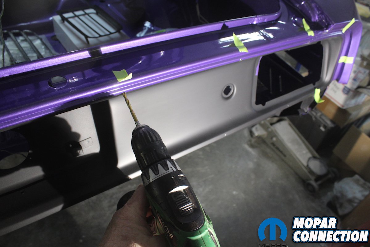 Above: In hindsight, we should have noticed that the new AMD panel was not drilled for the stainless trim. The holes would have been easier to drill before paint. But by drilling now we must be very careful or things could get complicated real fast. There was no way that we wanted to have to repaint the rear of the car. Using Chet’s AAR as a guide, we carefully marked where the trim holes should be drilled. We used a very fine punch to make sure we did not have any walking of the drill bit when drilling these holes. By taking our time and being very careful, all the holes were successfully drilled in the correct places for the trim.