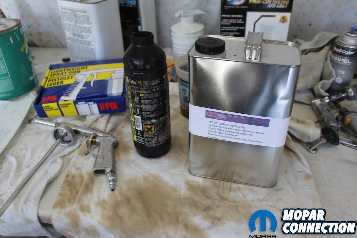 Above left: Resto Rick’s undercoating is as close to the original undercoating as you can get. A gallon will cover the inside of the quarter panels before paint and the wheel wells after paint. If your car is fully undercoated, you will need two gallons. Using a “shutz” gun you can spray the undercoating and it will come out great! Above right: Getting started on shooting the undercoating, several precautions need to be taken. This stuff is messy and cleaning it off the floor, clothes, and your skin is difficult. You must use a solvent since it is petroleum based while cleaning it up. So, we used a big drop cloth, long sleeve shirt, rubber gloves, and a face shield.