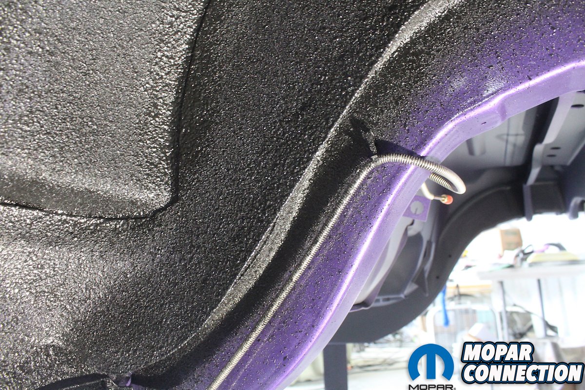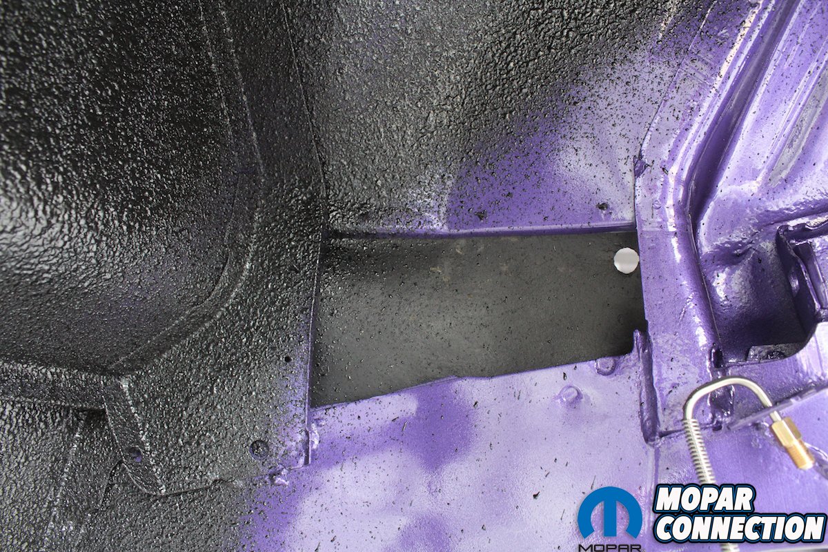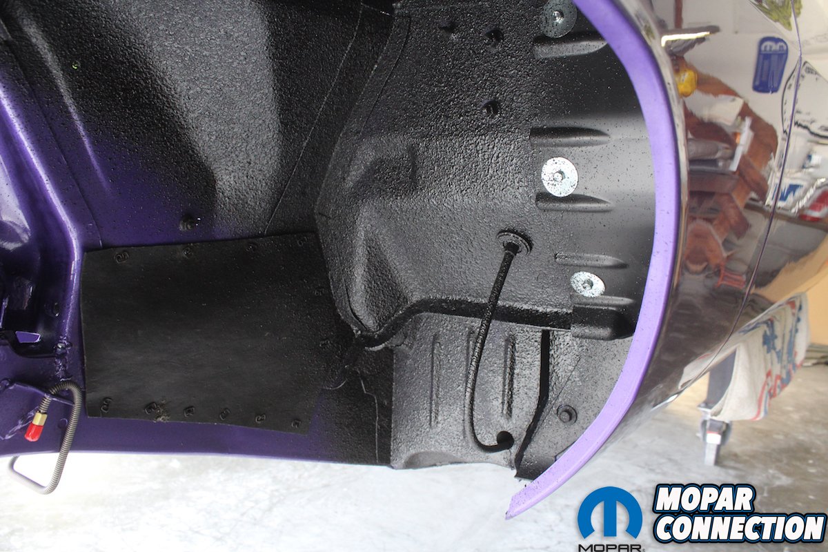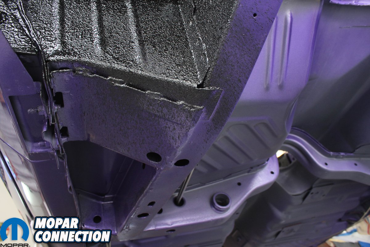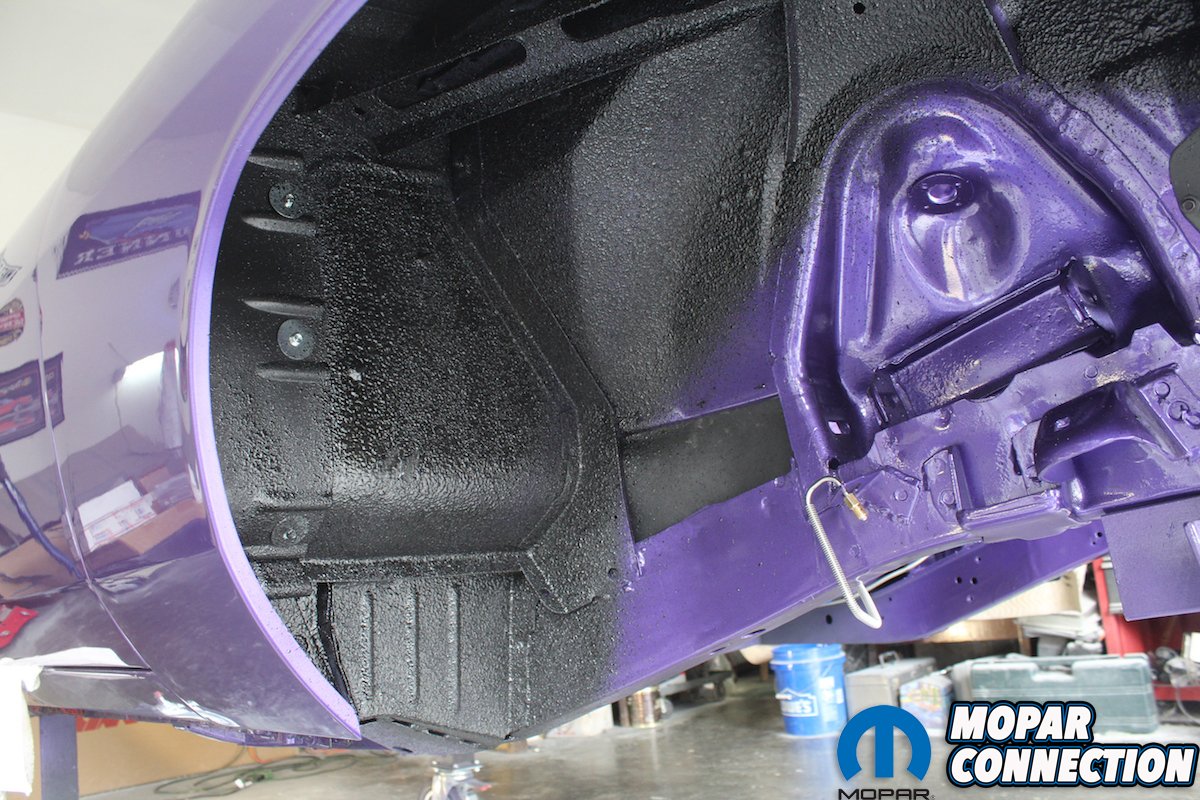 The Comeback ‘Cuda was not a factory or dealer-undercoated car. Many restorers will not apply undercoating to the wheel wells because it looks messy. But we usually never say all, but all Chrysler-produced cars from this era (no matter the color) got undercoating in the front and rear wheel wells. Even though depending on the line worker and how he was feeling that day, variations of how much was applied exists. Again there are enough original examples of cars out there to provide a clear designated area for the undercoating. We always use Resto Rick’s undercoating and it never disappoints.