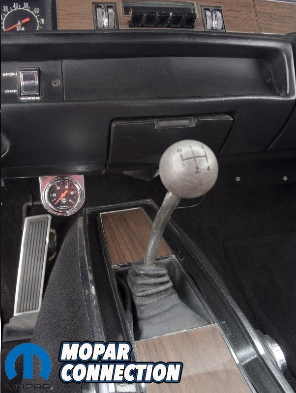 The suspension consists of a Mopar 8¾ axle housing with a 489 case, 3.55 gears, factory Sure-Grip, Green bearings, and leaf springs, which were refurbished to factory specifications. However, the front leaf spring mounts were replaced, along with the bushings and shackles. The shock absorbers are from Monroe. Dewees also replaced the pinion snubber with a stock unit, sway bar and bushings with factory parts, end-links, upper ball joints, control arm bushings, and idle arm.