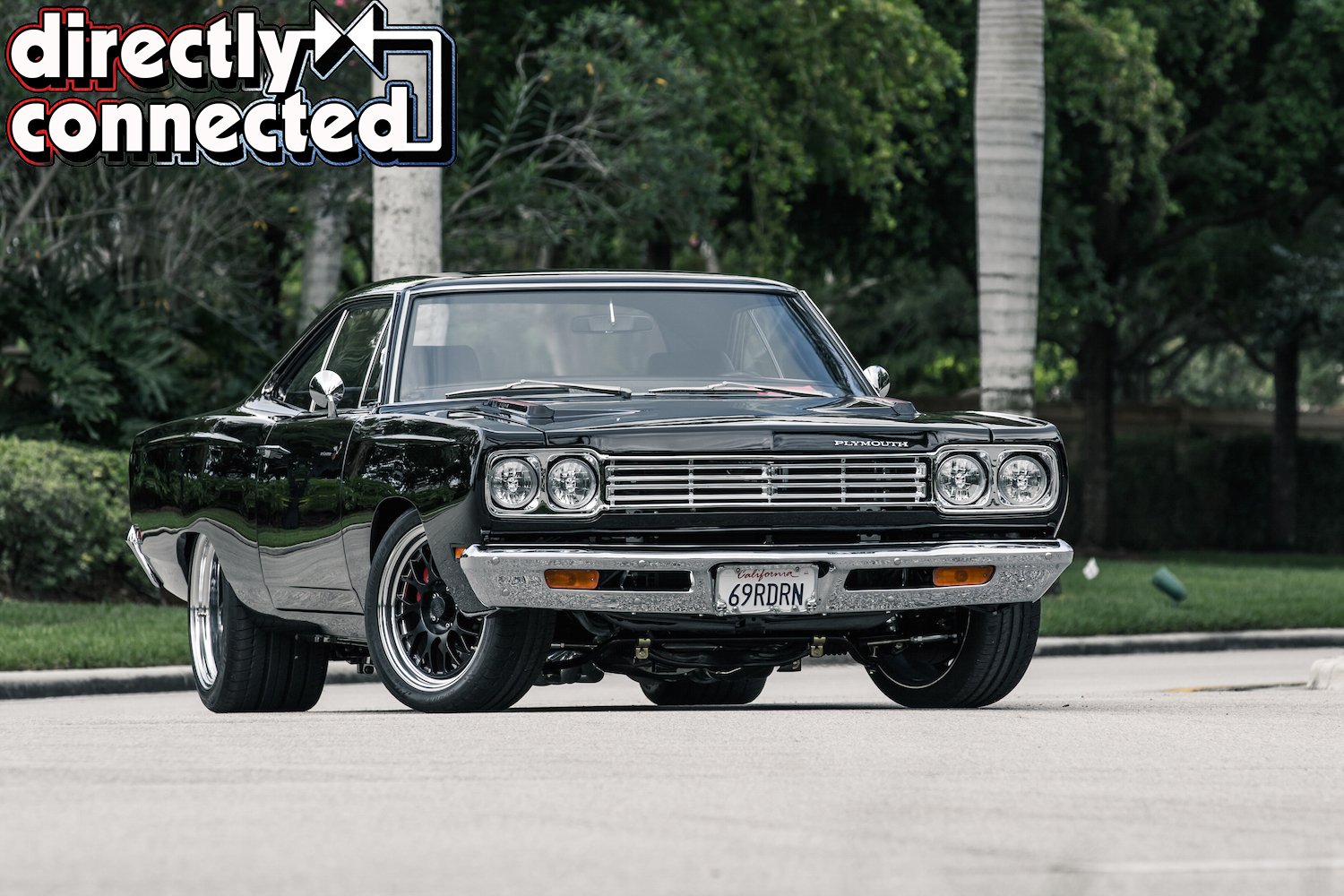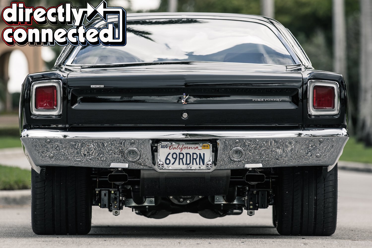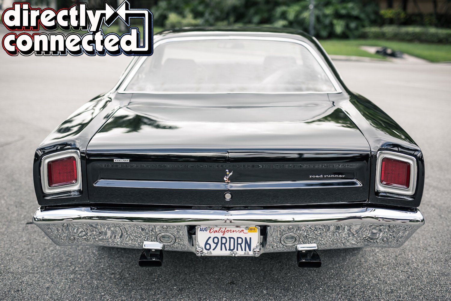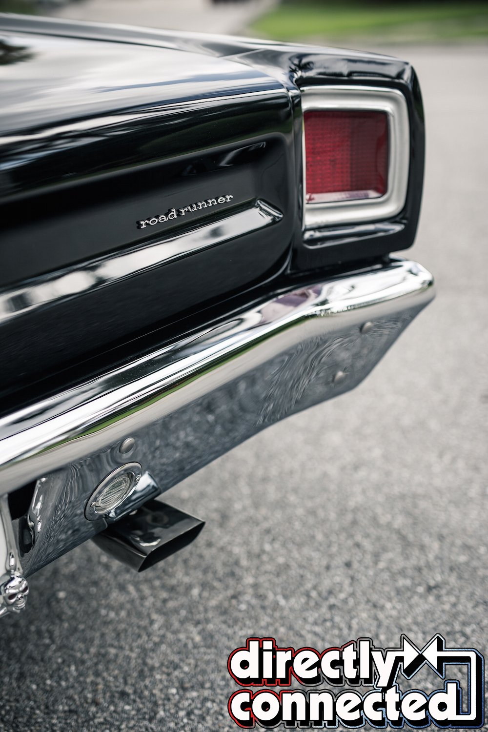 Prior to that, every single square inch of sheet metal was covered in Sherwin-Williams “Back in Black” two-stage urethane: three coats of color, three coats of clear, then a full color sand, then three more coats of clear, another color sand, and finally a complete buff job. The result is a mirror surface. Once finished, Bair Customs installed a custom chrome-plated grille and a quartet of H4 skull conversion headlights. side marker lights, and a pair of new LED taillights. Factory original HEMI badges, correct Road Runner emblems and decals, and Road Runner script emblems.