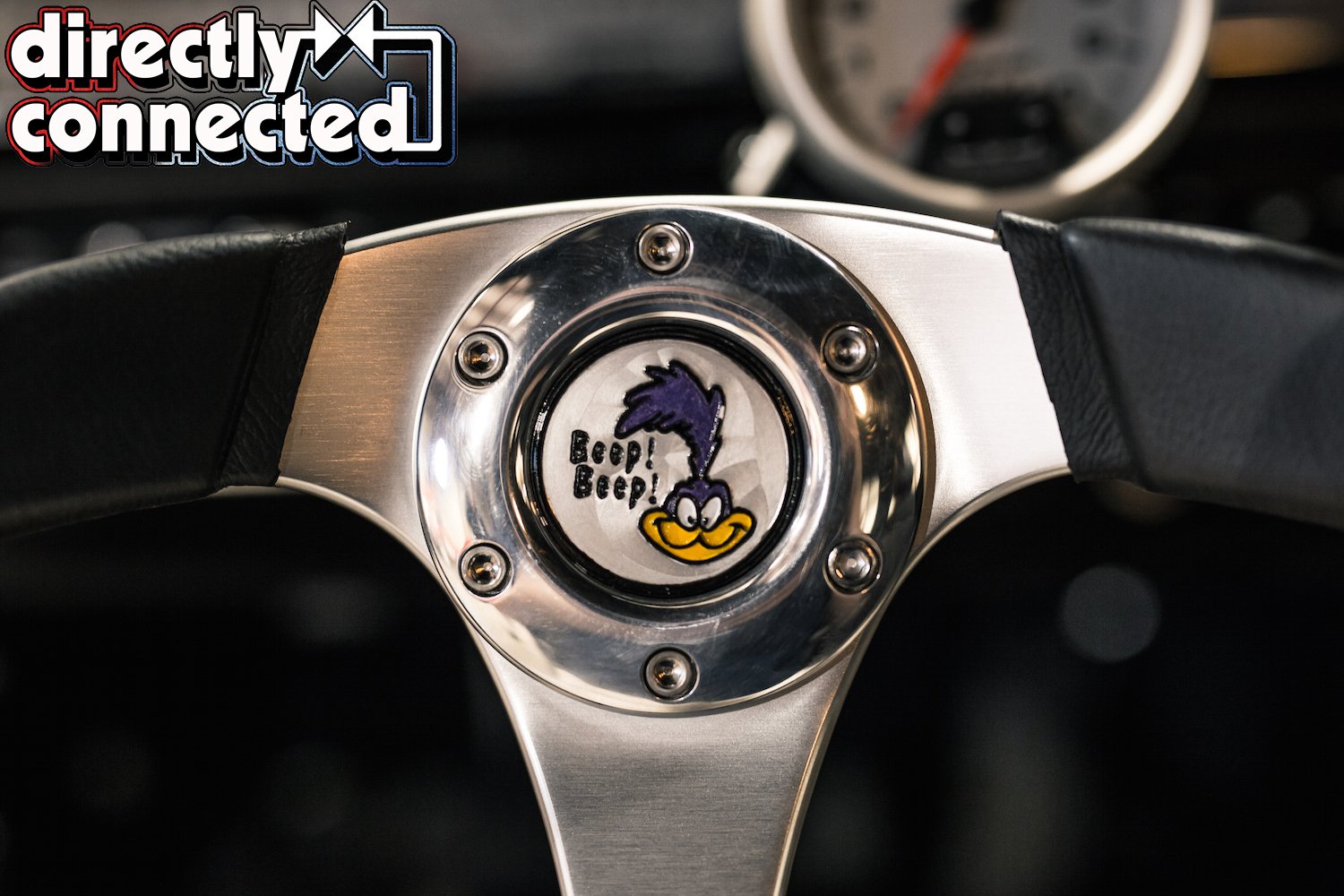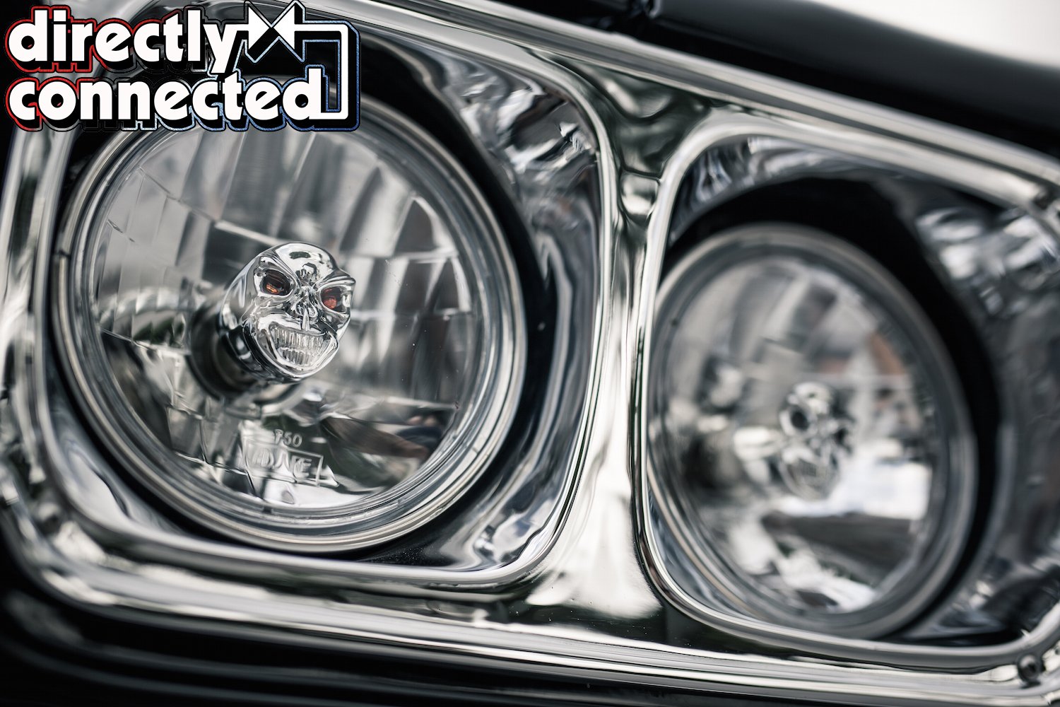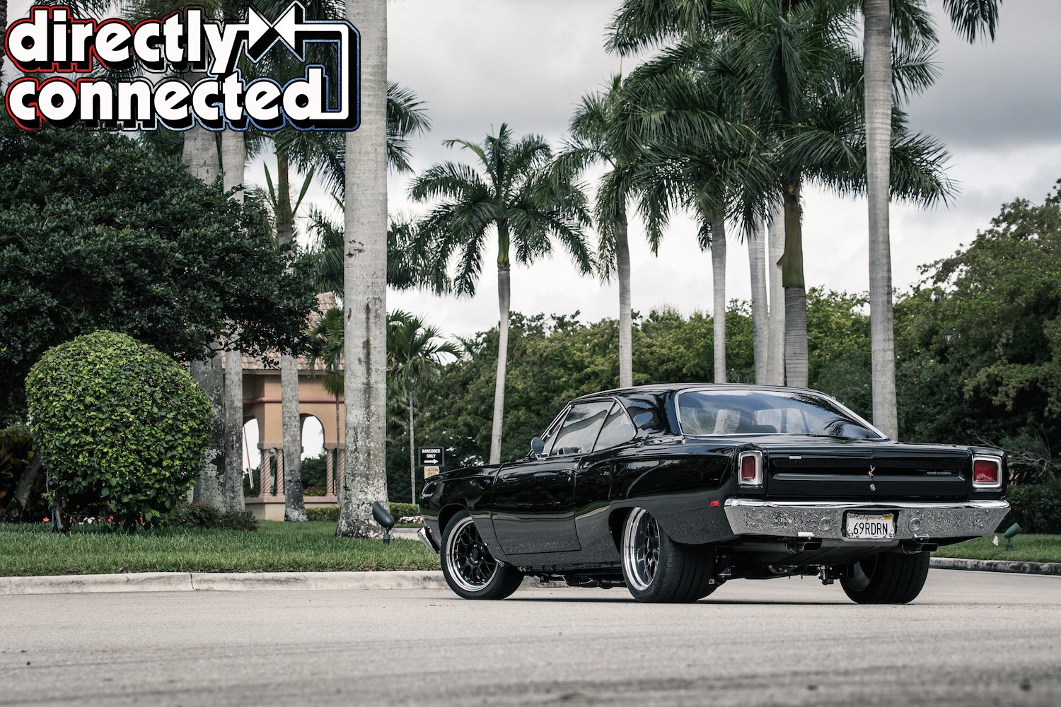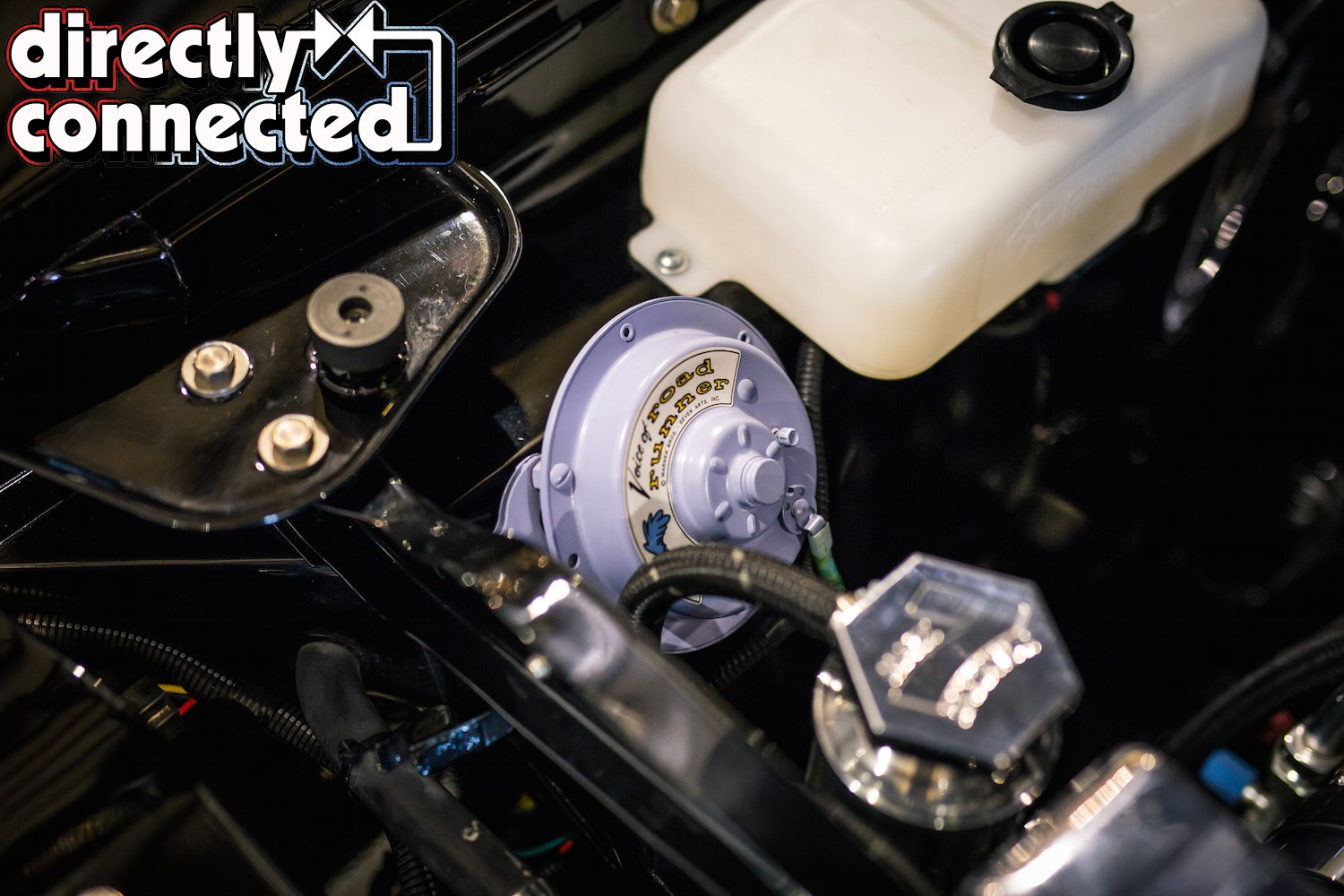 Prior to that, every single square inch of sheet metal was covered in Sherwin-Williams “Back in Black” two-stage urethane: three coats of color, three coats of clear, then a full color sand, then three more coats of clear, another color sand, and finally a complete buff job. The result is a mirror surface. Once finished, Bair Customs installed a custom chrome-plated grille and a quartet of H4 skull conversion headlights. side marker lights, and a pair of new LED taillights. Factory original HEMI badges, correct Road Runner emblems and decals, and Road Runner script emblems.