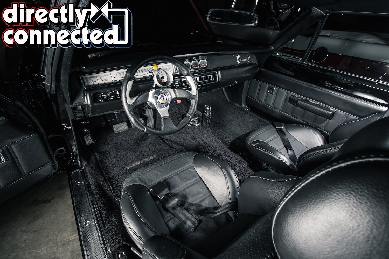 As Bair states, “The interior takes only a few liberties with the original design, but I promise you’ll love the results. The modern leather bucket seats, which have silver stitching that is so subtle that you almost miss it, work perfectly with the carbon fiber and black accents.” Custom leather door panels, and matching upholstered back seat are similar to how Ma Mopar intended but are executed far better. The dashboard is mostly OEM-spec, with the factory gauges rebuilt with silver faces, with only a gauge cluster mounted in the radio spot, and the column-mounted tach/shift light being the only true aftermarket additions. A custom steering wheel and carbon-fiber pistol grip shifter fill out the rest of the cabin.