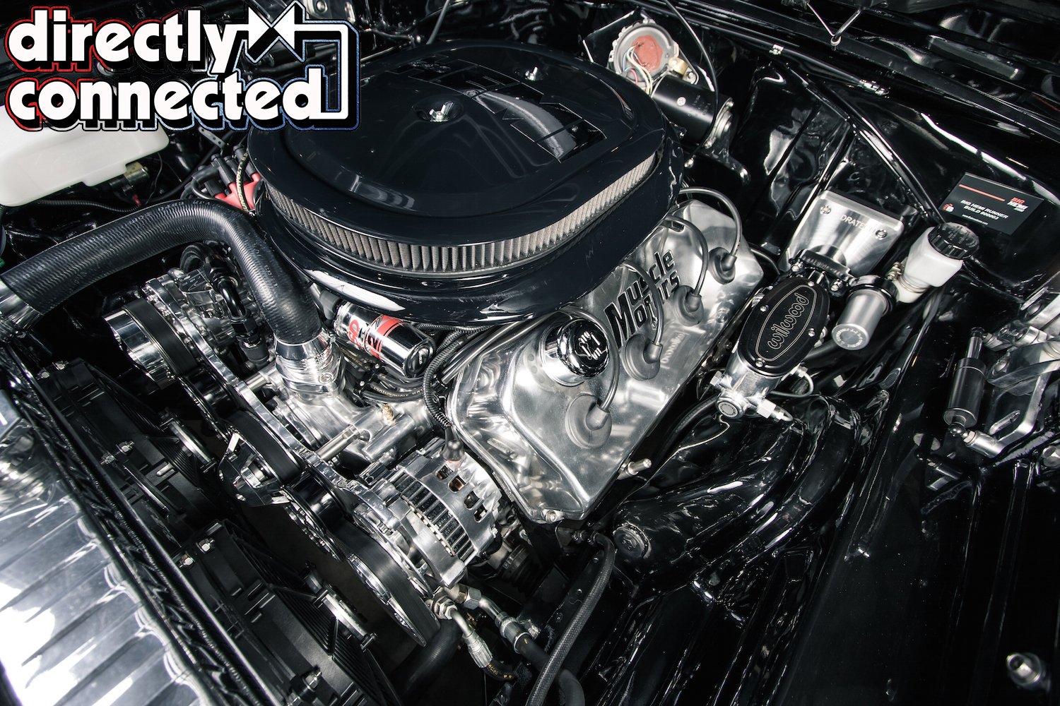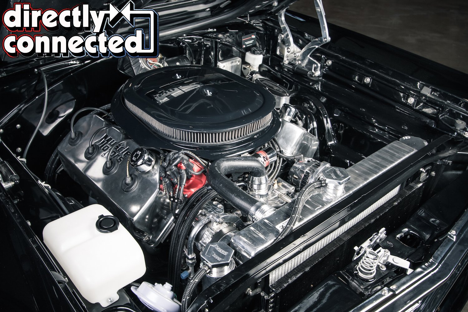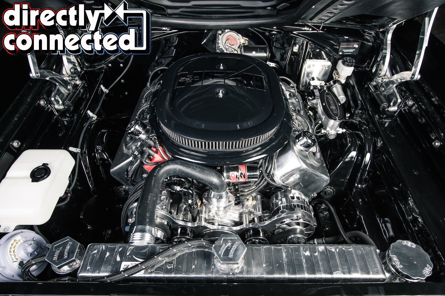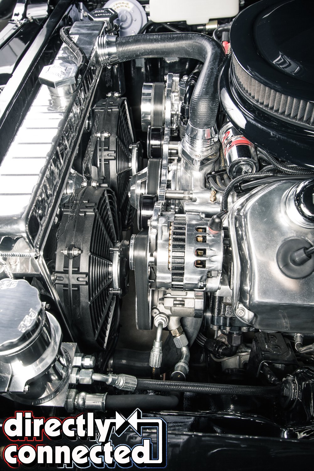 A Silver Sport Tremec 5-speed manual transmission conversion replaces the original TorqueFlight 3-speed automatic, and benefits from a deep overdrive 5th gear, allowing to the big Hemi to cruise at highway speeds, thanks in large part to the 3.55 gears in the Dana 60 rearend. Bair also hid all of the plumbing wherever possible. AN fittings and premium braided nylon lines feed the engine from a custom stainless steel gas tank with an internal Aeromotive pump. A giant Mark 7 polished aluminum radiator is cooled by dual electric fans, and a serpentine belt system from Billet Specialties includes a 105amp Powermaster alternator, Sanden SD-7 A/C compressor, Mopar Performance aluminum water pump, and power steering pump.
