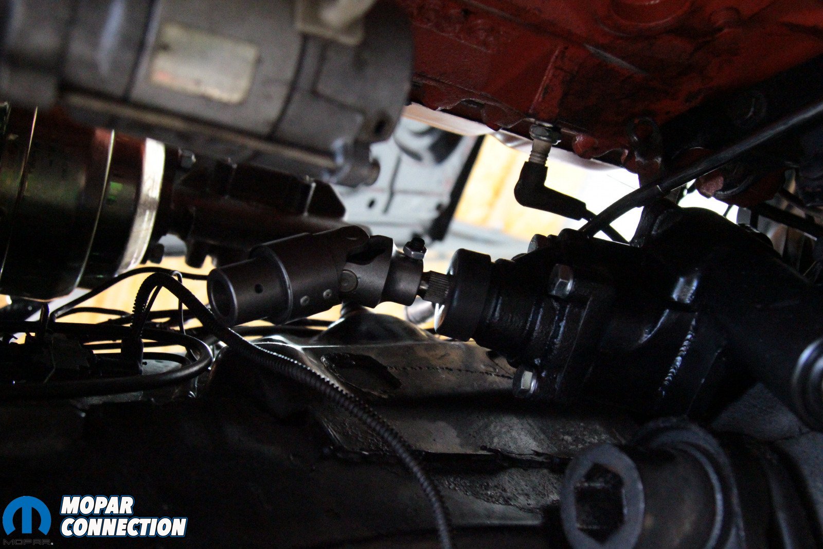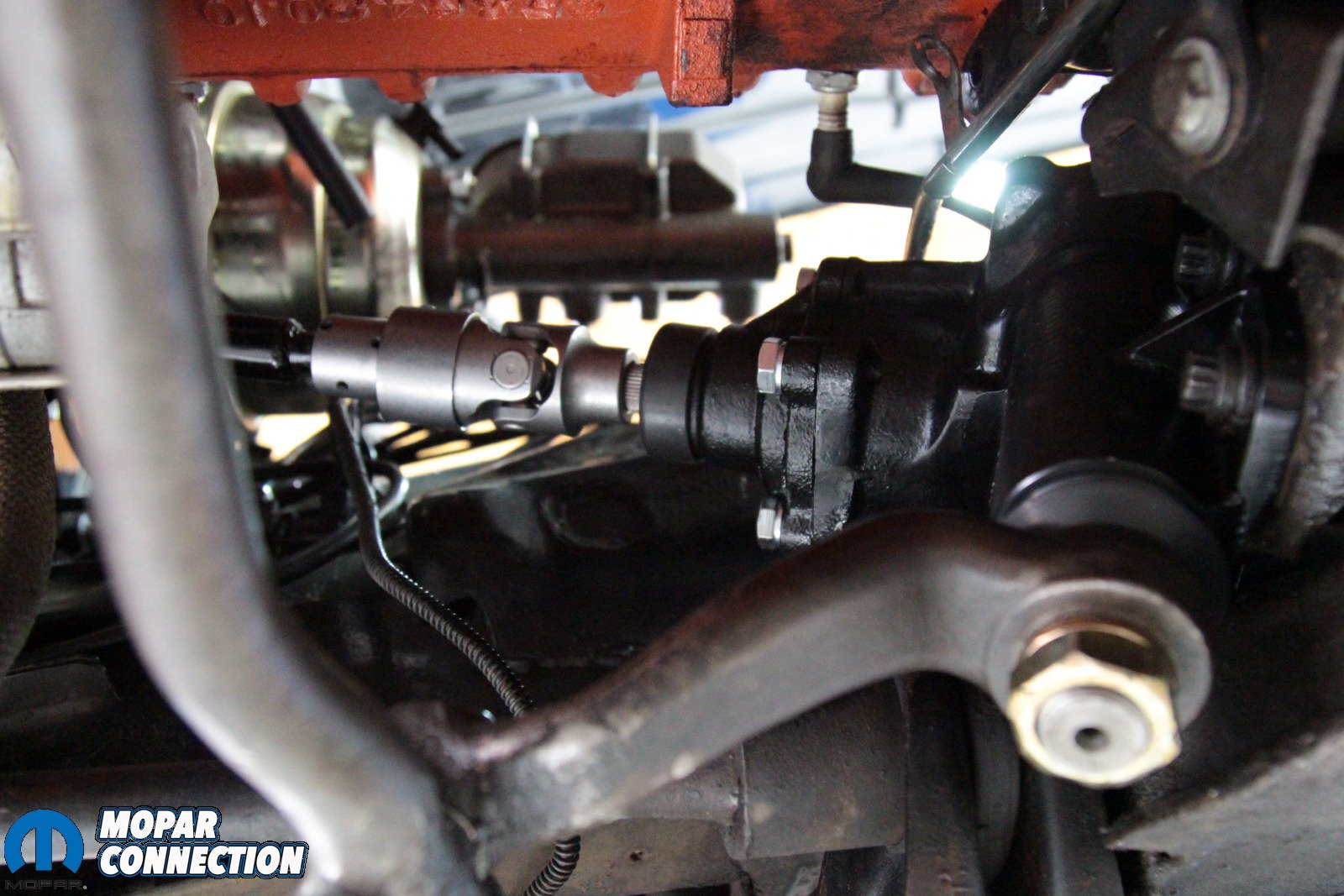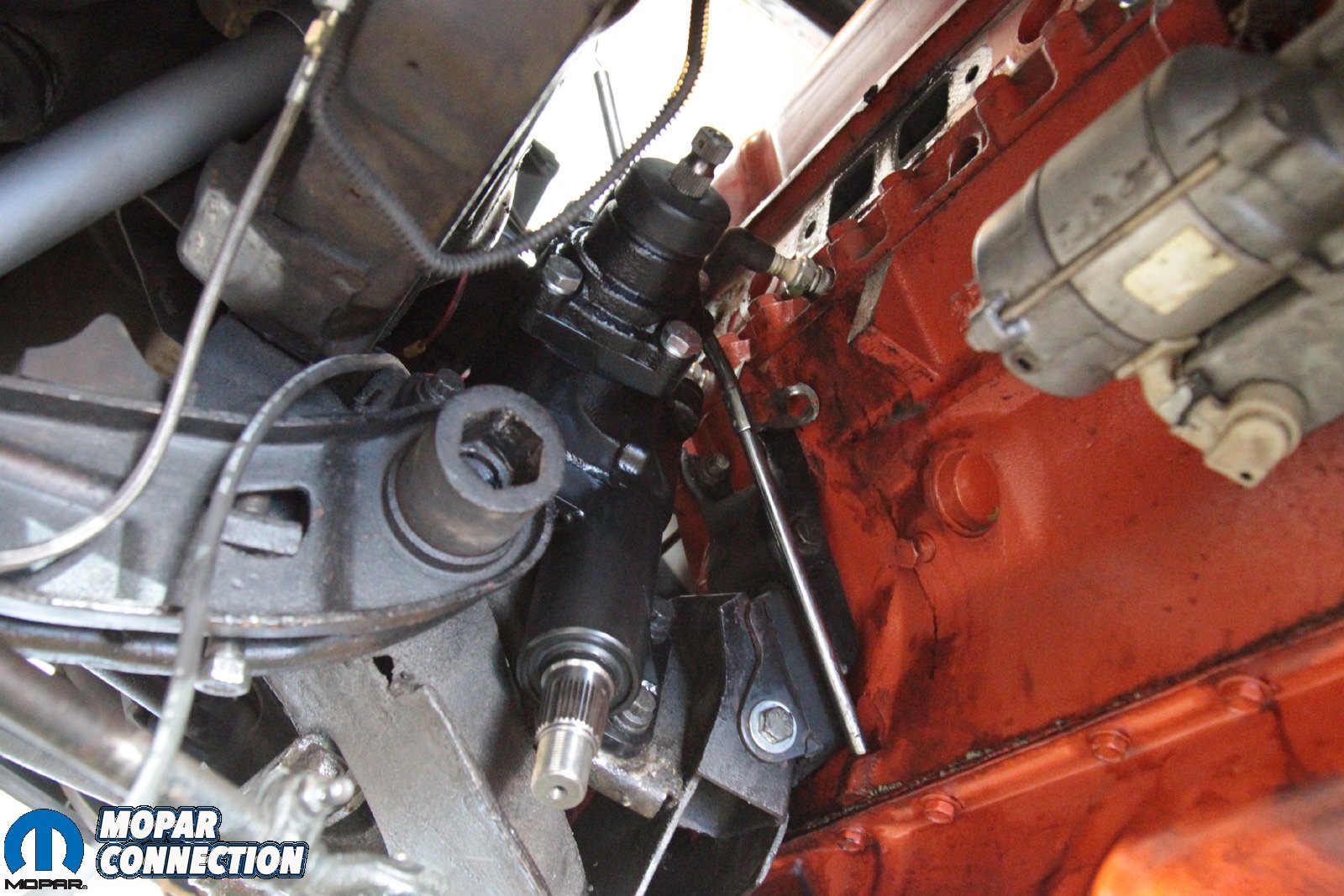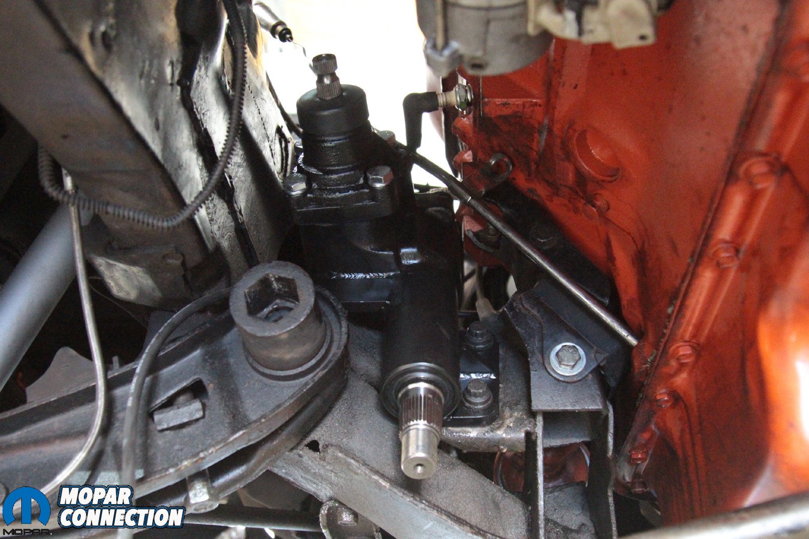 Above: It’s a tight fit in there, and that means that some components need to be removed – specifically the header and the torsion bar. However, not because of the Borgeson box – because Mopar. With those components out of the way, the box is far easier to remove.