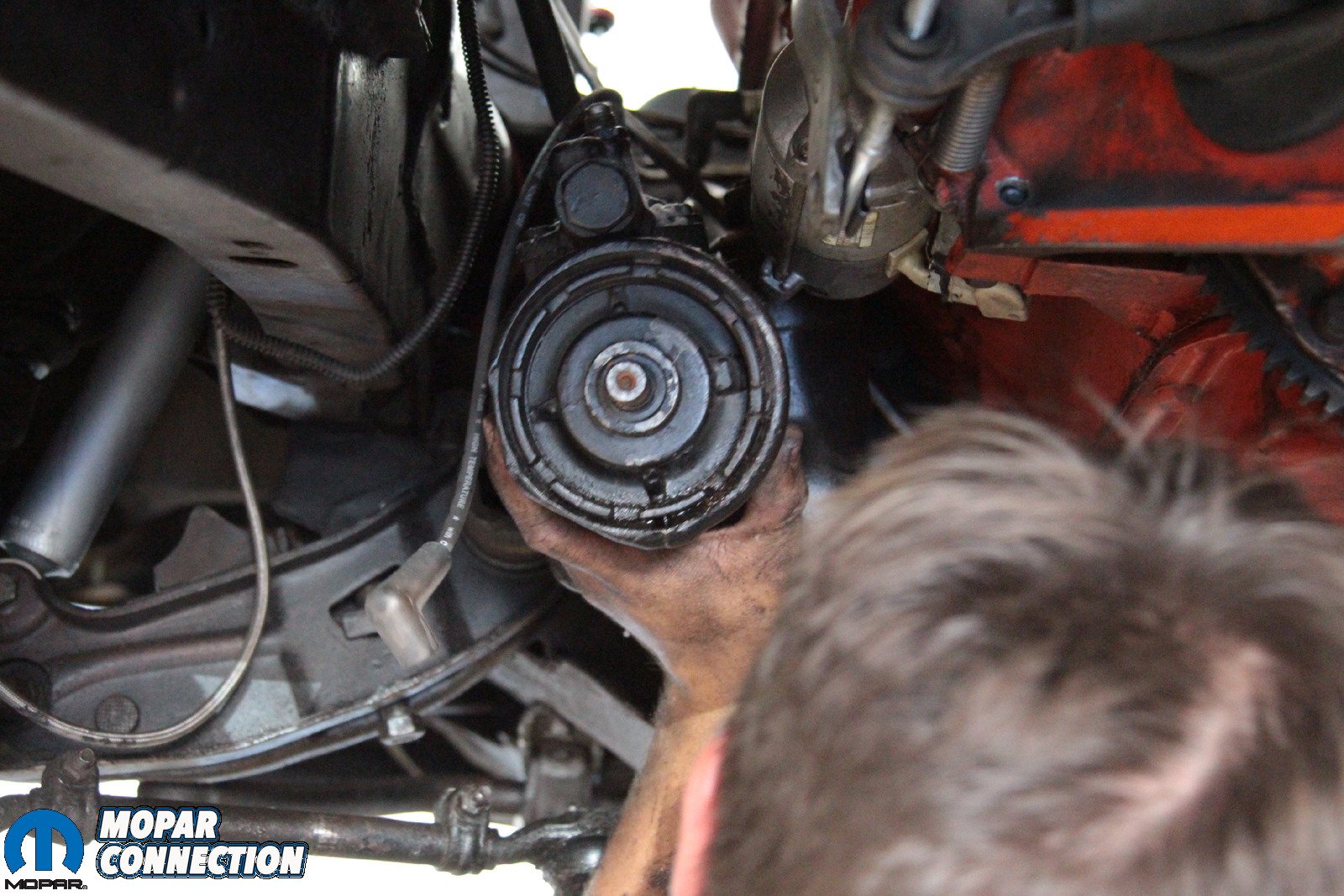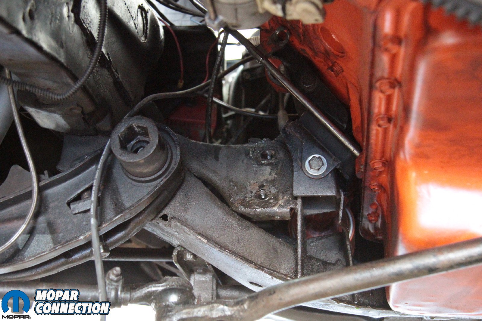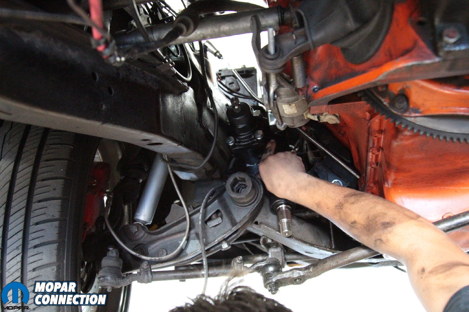 Above: It’s a tight fit in there, and that means that some components need to be removed – specifically the header and the torsion bar. However, not because of the Borgeson box – because Mopar. With those components out of the way, the box is far easier to remove.