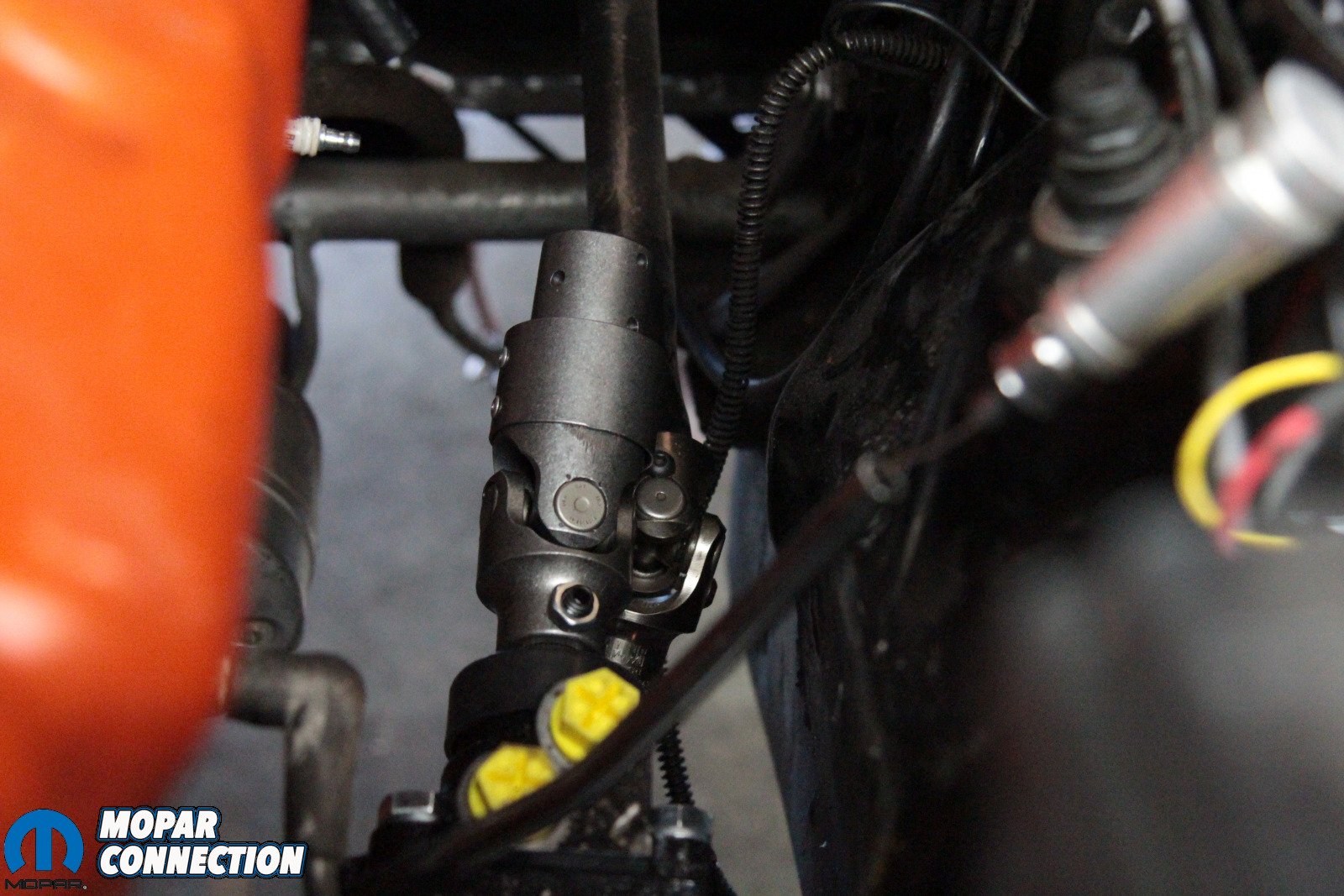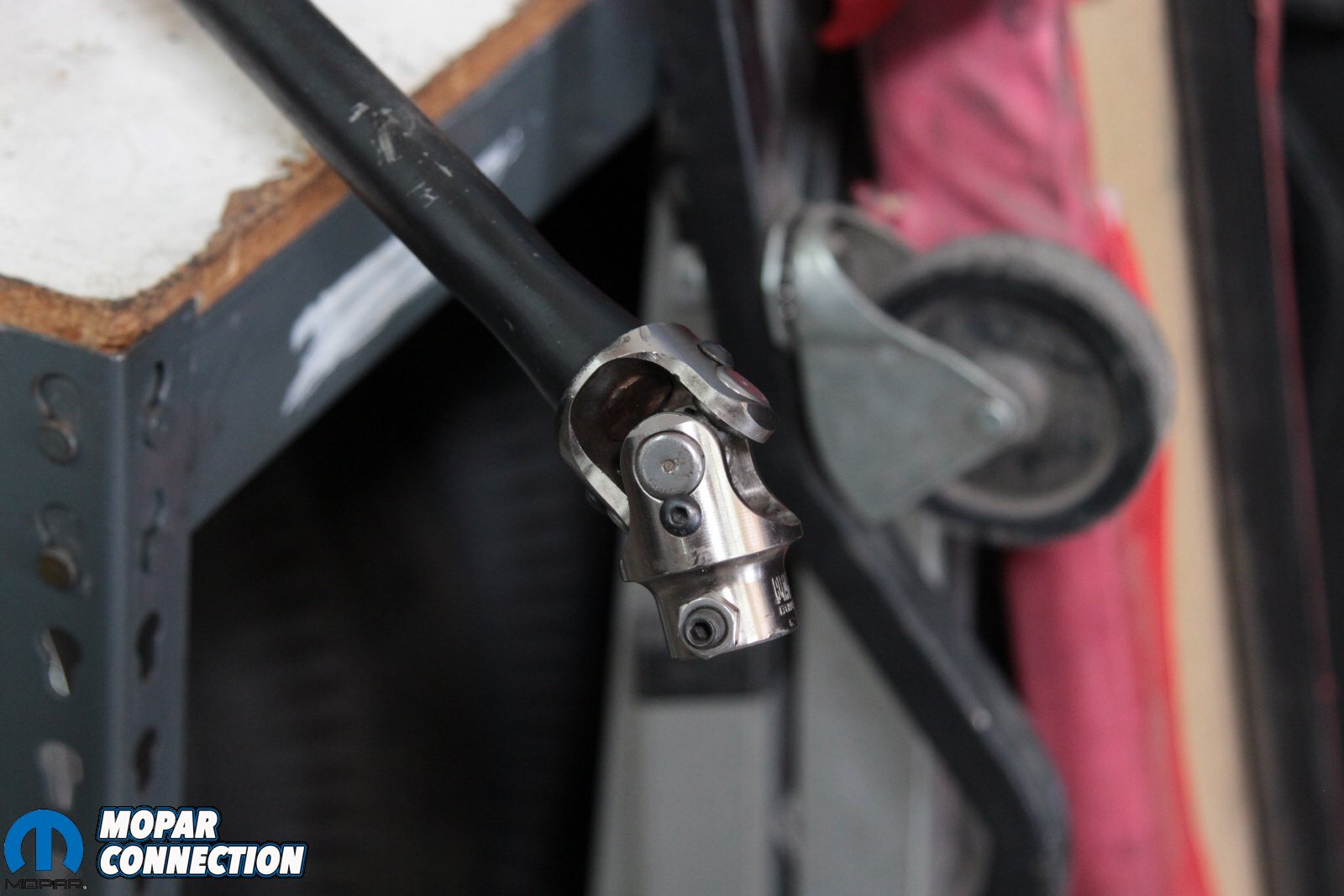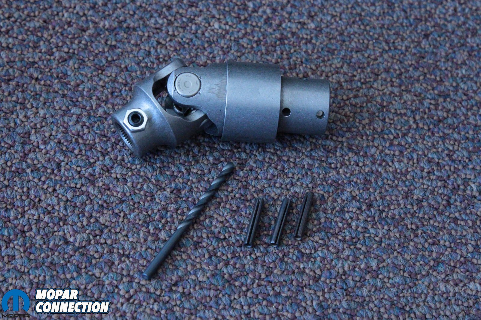 Above: The Borgeson coupler is designed to fit the input shaft and the factory Mopar steering shaft, so standard off-the-shelf couplers won’t work. Borgeson even supplied the hardened steel drill bit to drill into the factory steering shaft, so no guessing at what size is needed for the three roll pins.