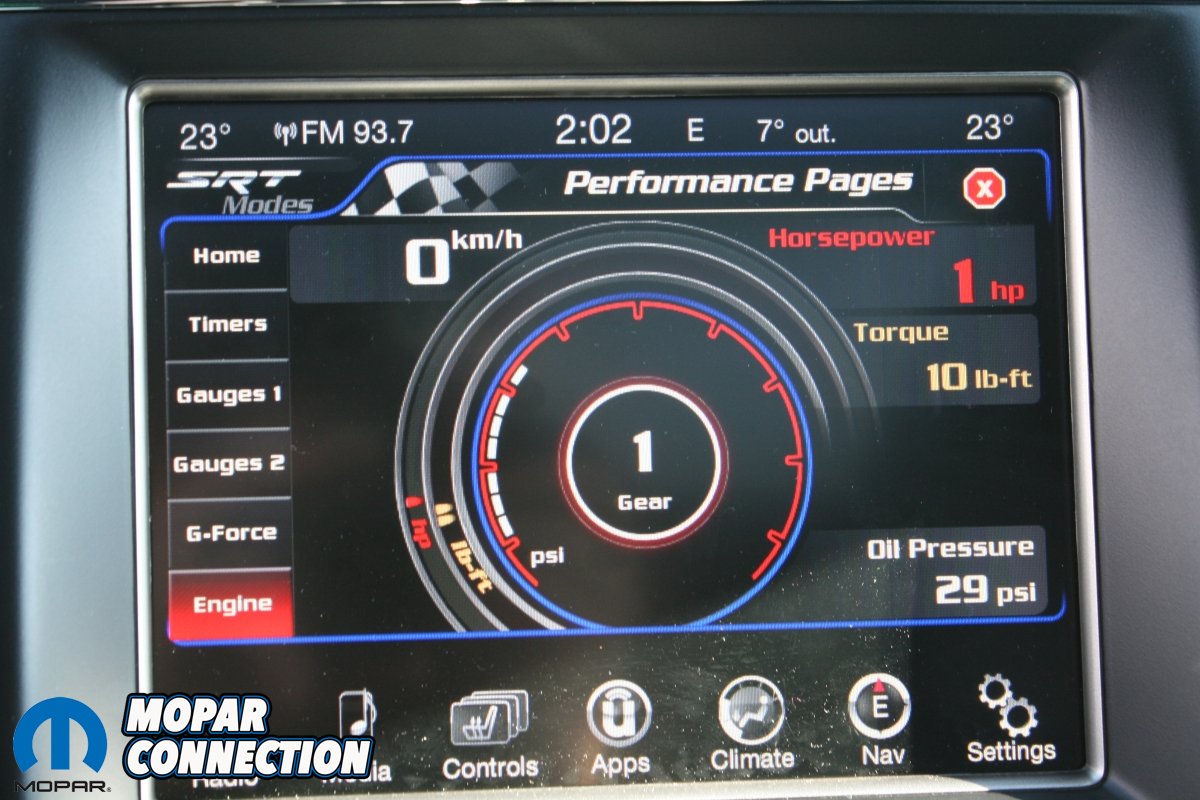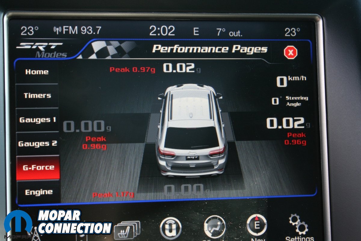 Standard on the SRT are the SRT Performance Pages which feature a number of timers such as Lap History and Time, Top Speed, Reaction Time, 0-160 KPH, 200M, 400M, 60ft, G-Force and Braking Distance. You’ll also find a number of very handy gauges that monitor the drive-train’s vital signs such as Oil Pressure, Oil Temp, Coolant Temp, Battery Voltage, Air Intake Temp and Transmission Temp.