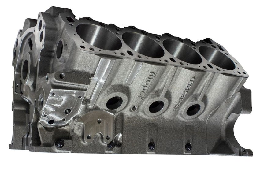 For the Hemi, four variations will make up the initial offering, all carrying authentic Mopar part numbers. The 4.245” rough bore blocks are available with finished (MOPP5160210AA) or unmachined lifter bores (MOPP5160211AA). Finished blocks can be had with a stock 4.250” (MOPP5160209AA) or a 4.500” (MOPP5160208AA) bore. All feature factory camshaft location.