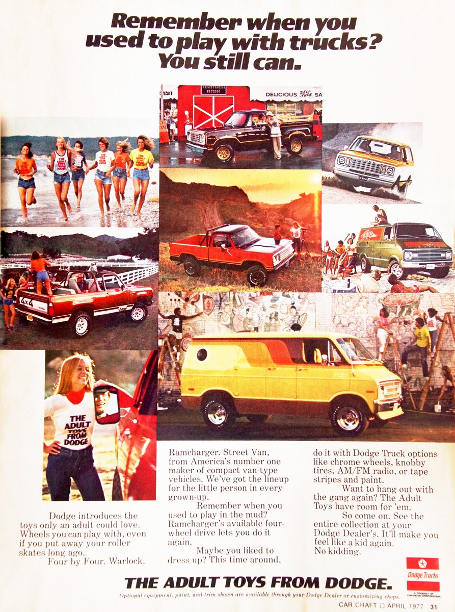 Dodge jumped headfirst into the van craze with its “the Adult Toys from Dodge” campaign depicted in the April 1977 Car Craft magazine ad. The aftermarket started pumping out front spoilers, grilles, moonroofs, fender flares, circle, diamond, and heart-shaped, etched-glass side windows, side pipes, whip antennas, and even simulated hood scoops. When the doors swung open, the interior was wall-to-wall shag carpet in a multi-tone color of rust, green, or blue.