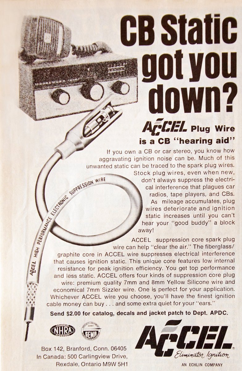 ACCEL employed the last option by modifying the resistance in its plug wires. As represented in the April 1977 Car Craft ad, ACCEL offered the premium 7mm and 8mm Yellow Silicone wires and the economical 7mm Sizzler wires.