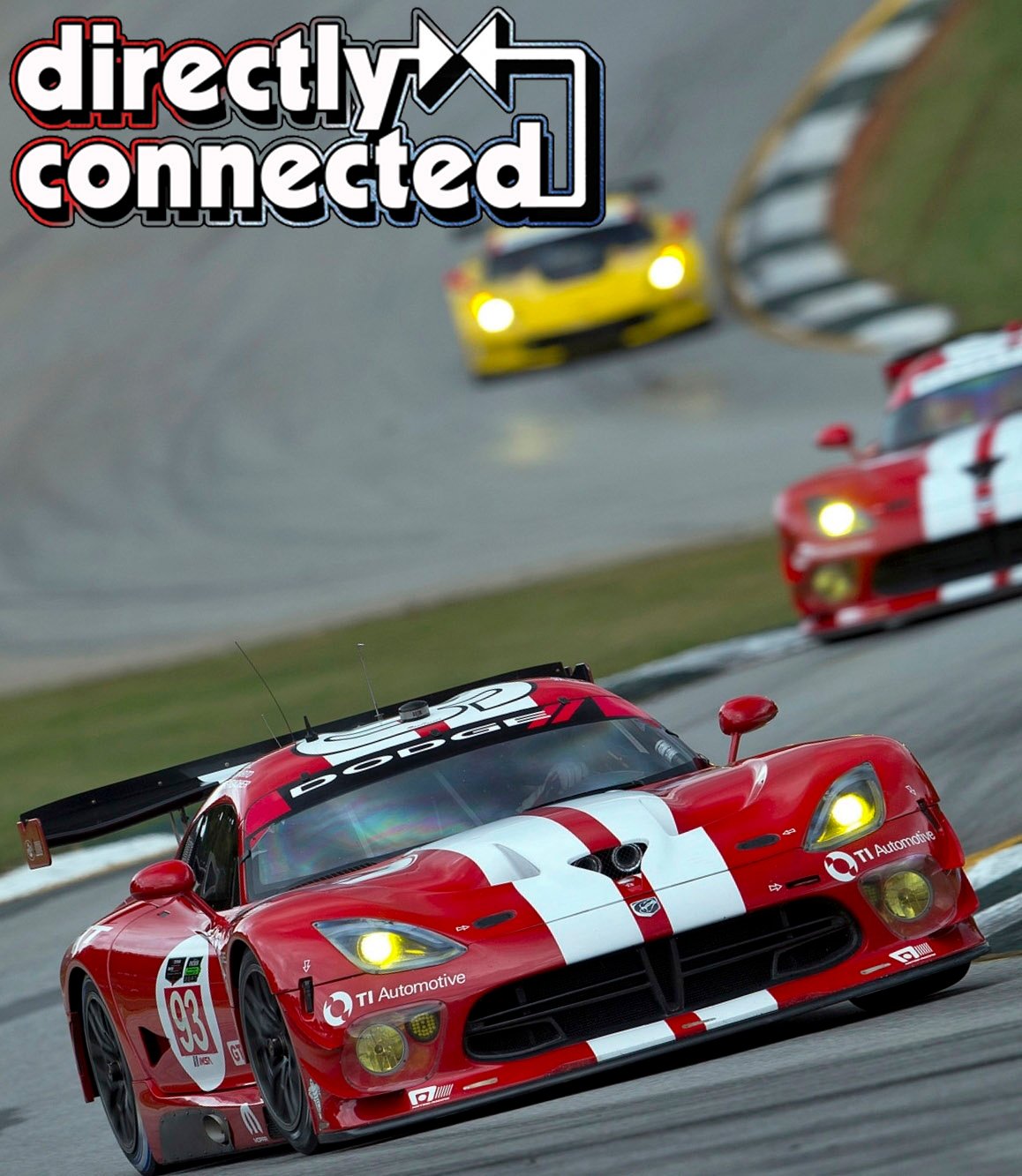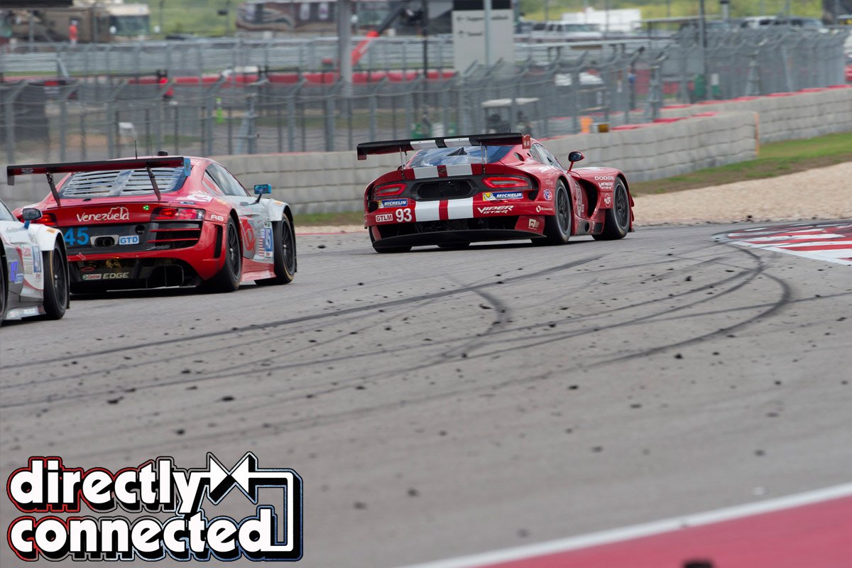 Above left: Viper GTS-R leads C7R Corvette through corner at Watkins Glen. Above right: The Number 93 Dodge Viper SRT GTS-R driven by Kuno Wittmer and Jonathan Bomarito started from the pole. Here, it’s leading two Audi R8’s on its way to finishing first in GTLM class in the IMSA TUDOR.