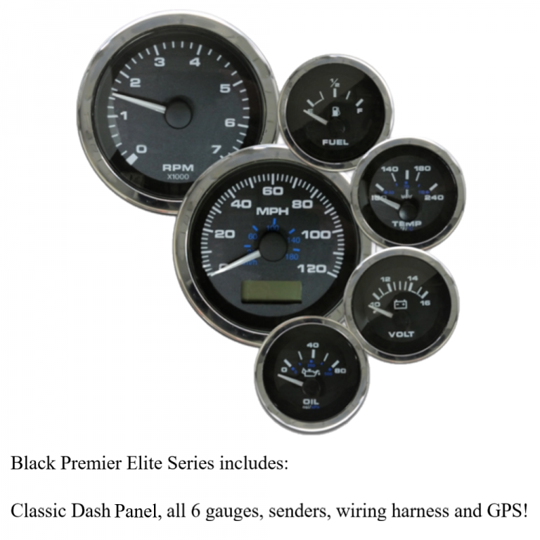 Within each Elite Series bundle are a 120 MPH GPS-enabled speedometer, 7,000 RPM tachometer, water temperature gauge, oil pressure gauge, fuel level gauge, and voltmeter. The speedo and tach are 3-3/8” and the remainder are 2-1/16” for a compact yet easily-visible cluster. Each and every one is assembled in the USA and comes standard with a five-year warranty. In the interest of maximum robustness, all pointers and dials are UV stabilized and the glass lenses are scratch-resistant.