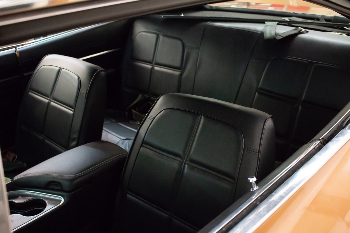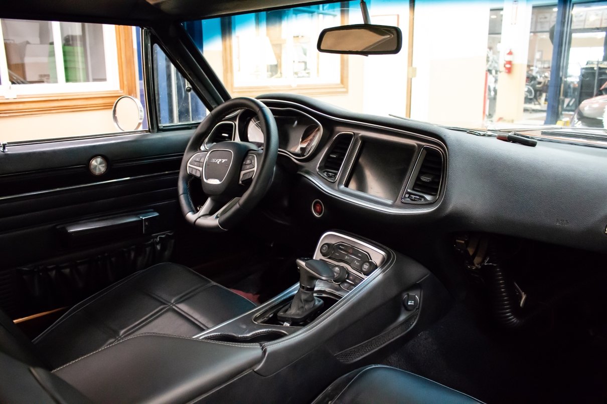 Kenny says, “We integrated the entire Hellcat dash along with the steering wheel, center console and the paddle shifters with the 8 speed automatic. That’s what the gentleman wanted and it’s the best way. It’s easy to put a standard transmission with the Hellcat engine. They make a wiring diagram for it and the wiring harnesses but we had to go through the originals and make our own for the car. Getting the electronics wired up and functional in this car was no easy feat. Back in 1969, they obviously didn’t have key fobs, paddle shifters, or touch screens so we knew that it would be a challenge.”