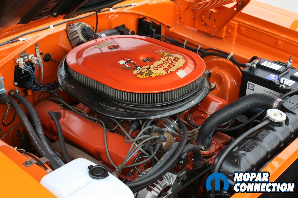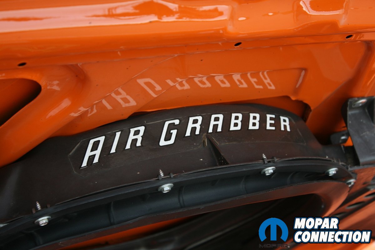 The couple continued forward with the restoration, doing everything themselves besides the body work and paint. The car was pretty solid and only needed basic metal work such as the quarter panels. The original N96 Air Grabber hood was shot as well as the original under hood duct work so a replacement needed to be sourced. “We got lucky with that one; we were able to find an original hood and Air Grabber set-up that were both in nice shape. The guy had taken it off a car back in 1971, put it in his rafters and completely forgot about it! We bought it from him and it went right onto the car,” says Larry. With the body work complete, the Road Runner was shot in a fresh coat of correct Omaha Orange.