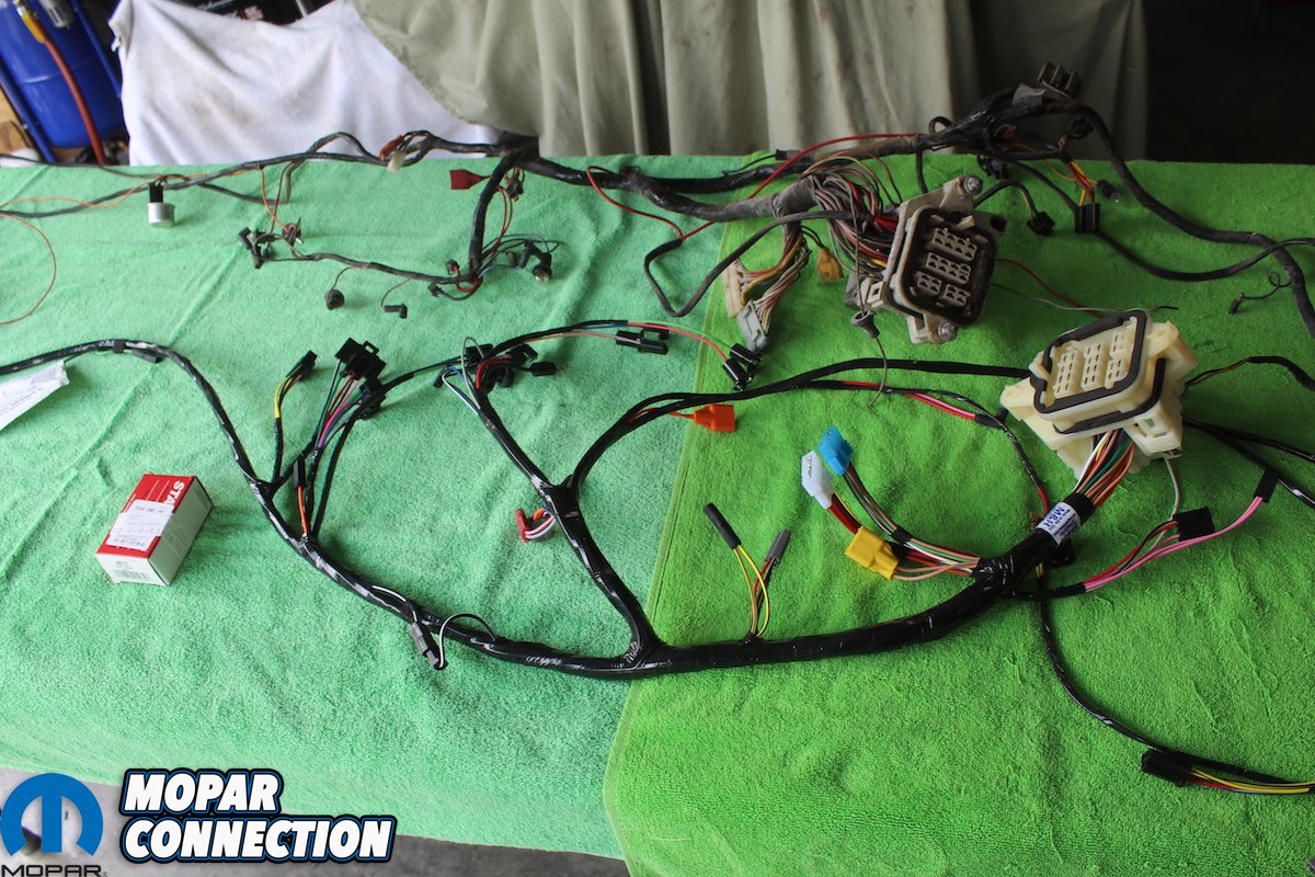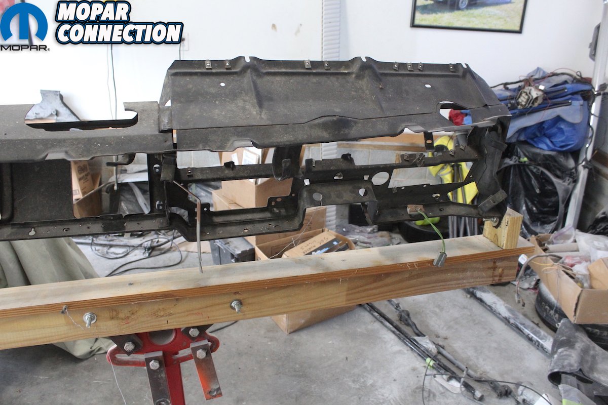 Above left: Next disconnect the dash wiring harness paying close attention to the routing of the harness. We then took the new wiring harness provided to us by Classic Industries, one of our valued sponsors of the Comeback ‘Cuda. We cannot say enough about the quality and correctness of this part. It is the only way to go. It is recommended that you compare the old wiring harness to the new one to make sure they are the same. When we did, we indeed found out we were missing the convertible top switch wiring pigtail. So, we ordered one. Otherwise they were exact and matched up correctly. Above right: Here is a clear picture of the dash support we built with the dash attached, and almost everything but the dash pad removed. We also attached a wire to the front and back side of the support, so we had a safety wire for when we had to tilt the dash forward or back. Since it is mounted on a rolling engine stand, we could move it wherever we needed.