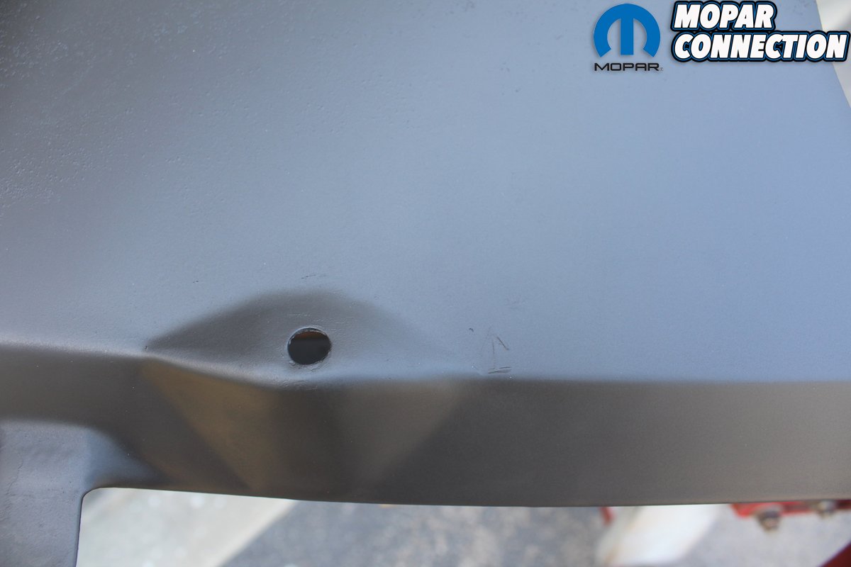 Above left: We didn’t want to remove the VIN from the dash since it was in great shape. So, we masked it off and cleaned it to the bare metal with lacquer thinner. This was done before we finished the dash pad. It is painted a semi-gloss black also. After it dries, we applied the “dry rub” Chrysler decal from ECS. As far as we know they are the only source for this decal. They also have an abundance of other totally unique products to make your restoration as original as possible. Get one of their catalogs or go online or call 855/532-7846 today. Above right: By using the SEM Landau black in a spray can, we were able to reproduce the correct finish on the dash pad. We cleaned the pad with lacquer thinner let it dry and then masked off the VIN. With a couple of medium wet coats, the pad looks great. It even retained its original “grain.”