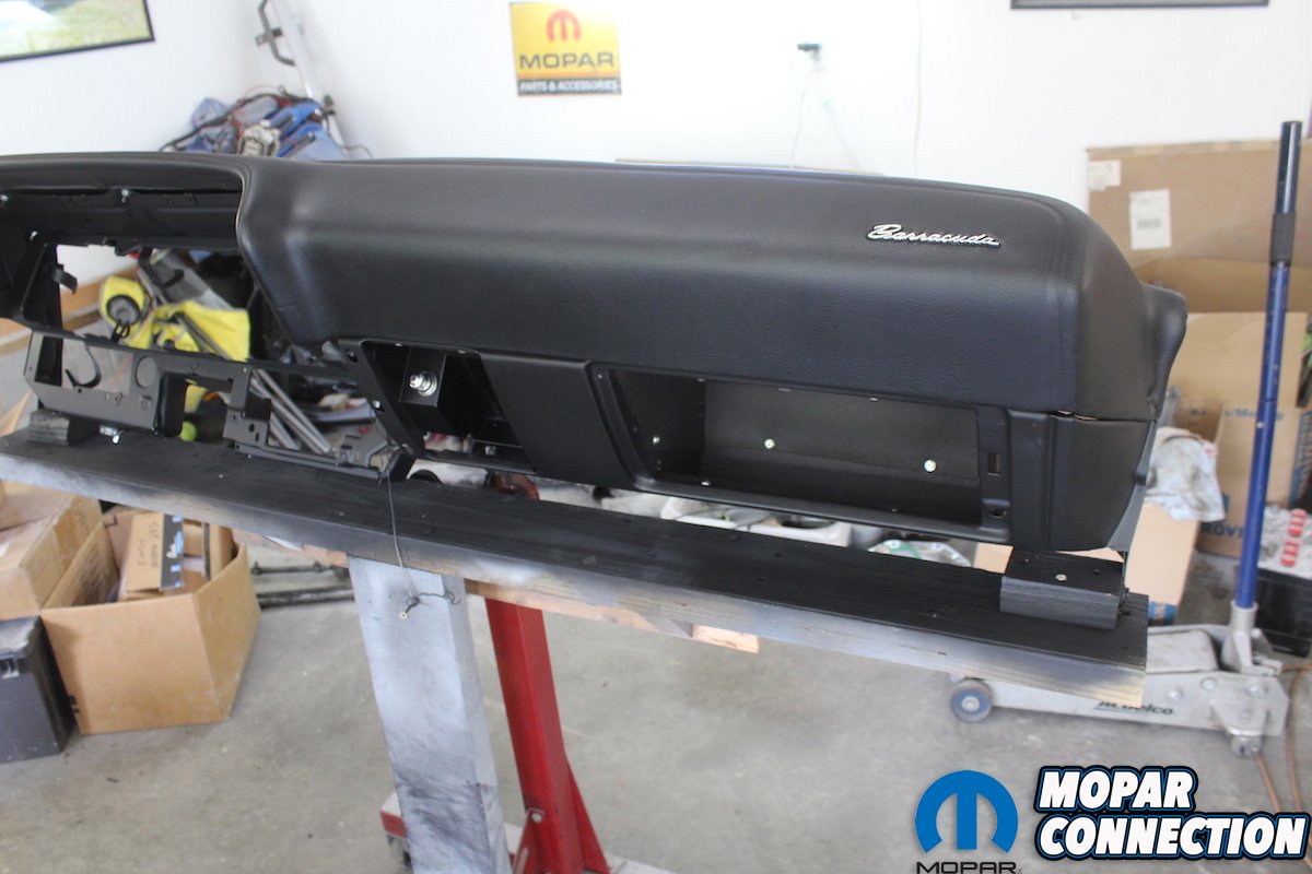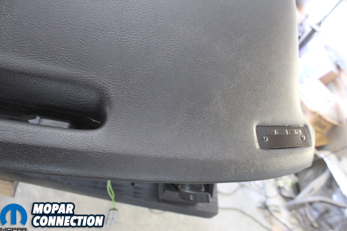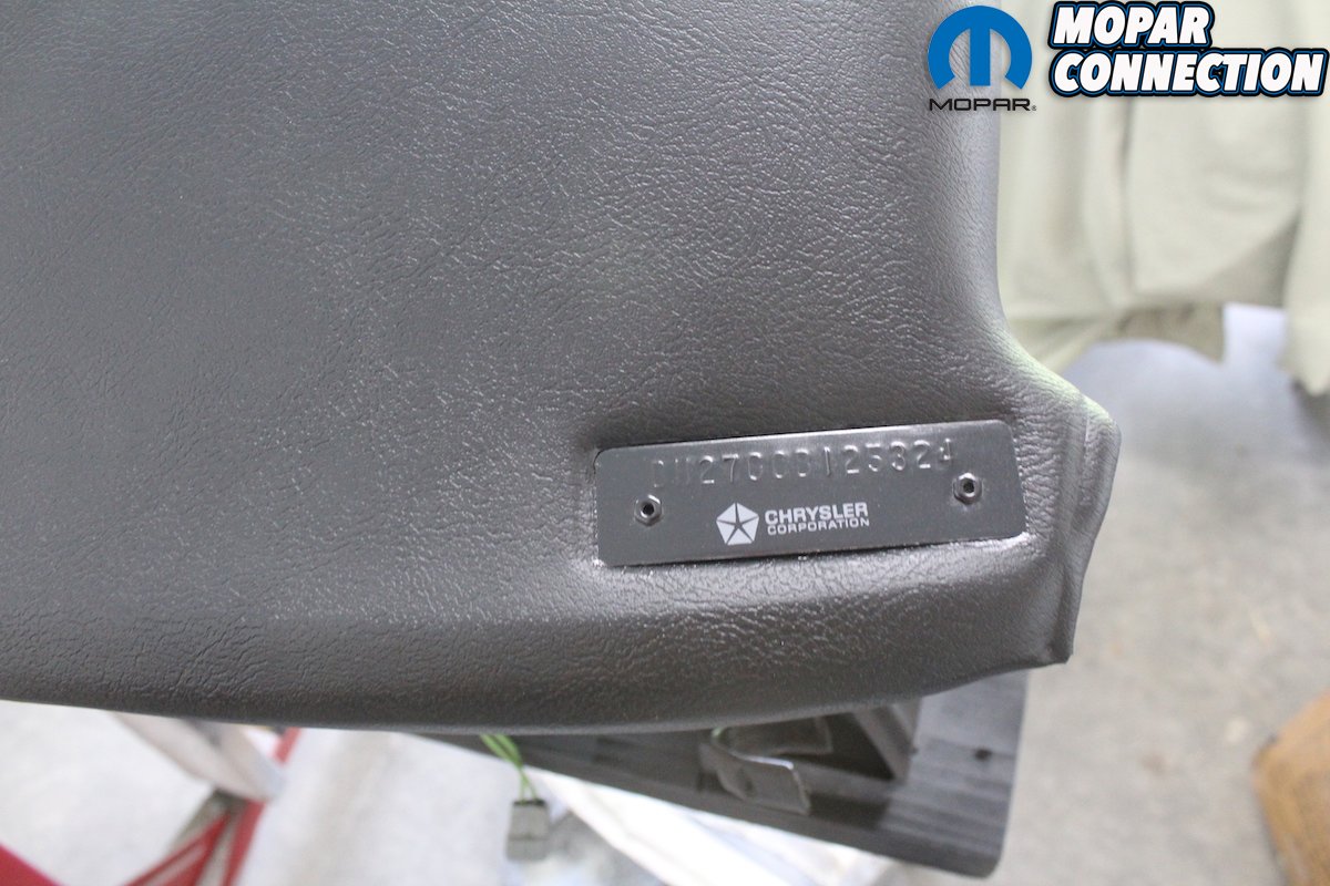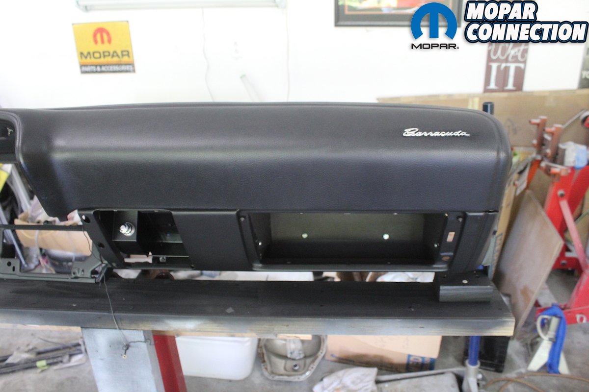 Above: We removed the rest of the pieces of the dash and the dash pad was in fantastic shape. No cracks or dents. Notice the one year only chrome script saying “Barracuda” on the pad. It is molded to the pad and so much care is needed when detailing the dash pad. The VIN is attached to the pad with the factory rivets and will require a different finish than the pad itself. As always bag and tag all the attaching hardware.