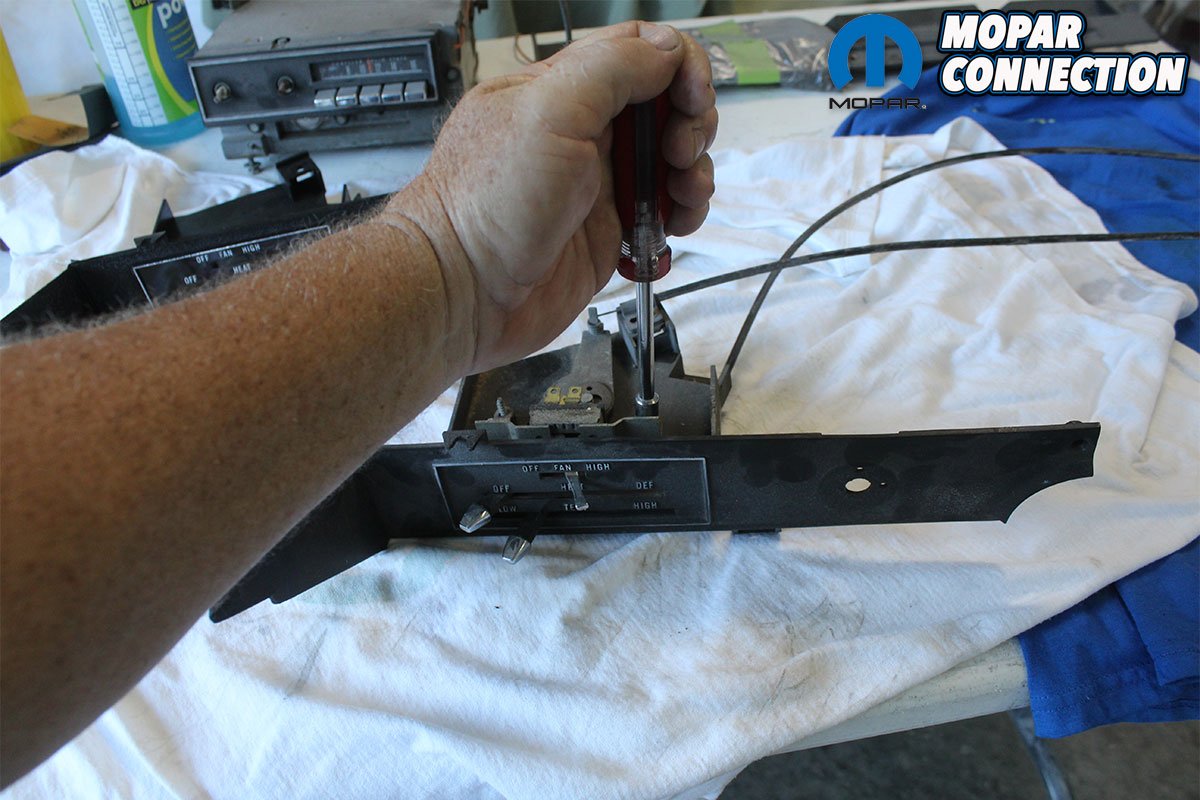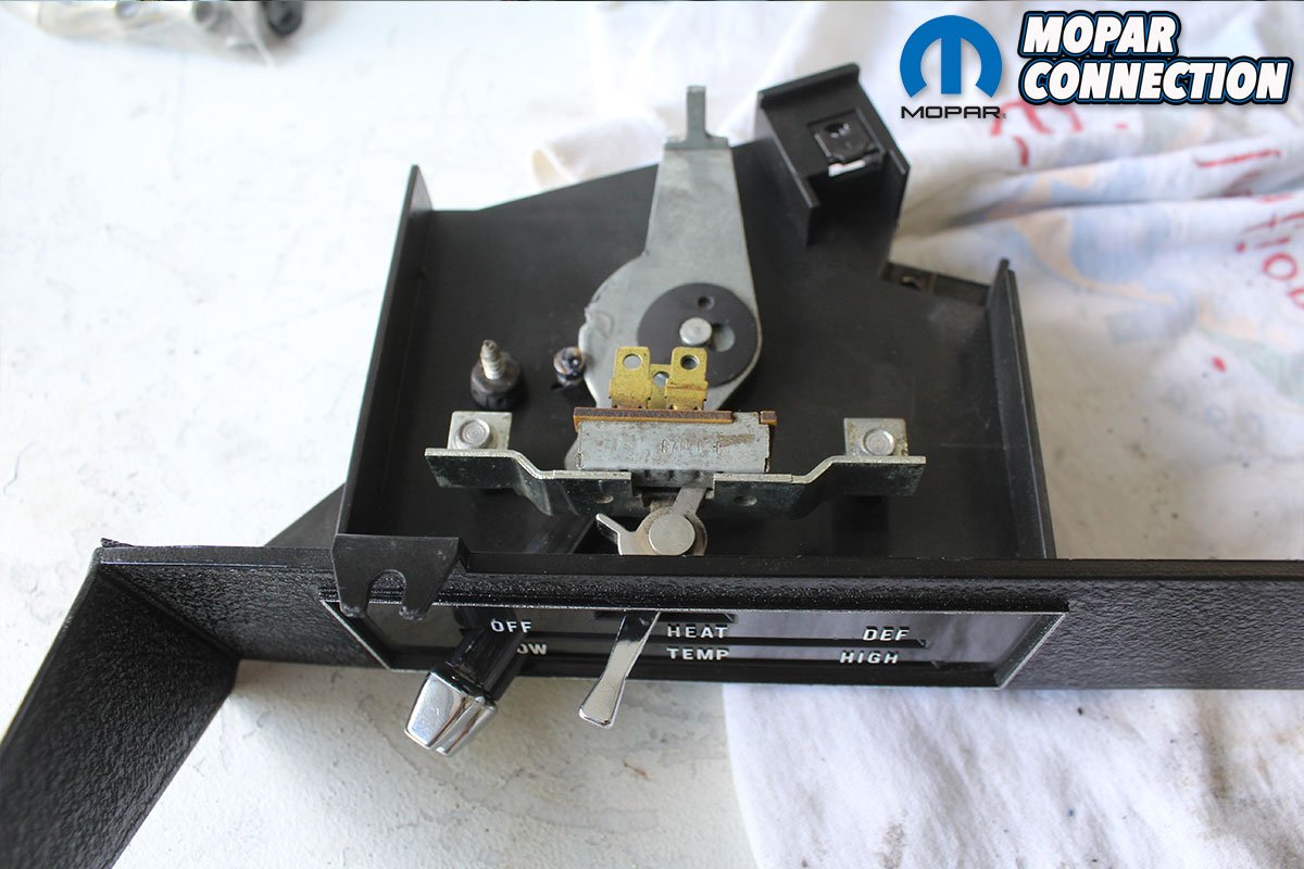 Above Left: With the new knobs installed, we polished the blower motor switch knob and attached it to the plate. You can also see there is a spring-loaded roller that holds the lever in the intermediate position. Be sure and lubricate it also and check for ease of movement. Above Right: With the dash pad already in place, we positioned and attached the heater control assembly. We used our interior screw kit provided by one of our great sponsors; YearOne. You will use both natural and black headed screws where they show to attach the assembly.