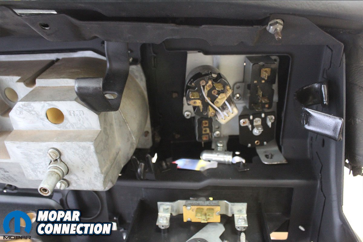 Above Left: You must install the wood grain facing on the cluster before you install the switch panel. Take your time since the wood grain goes behind the dash pad and the finish is easily scratched. With that done, you can install the switch panel. We took a manila envelope and cut a single 8.5″x11″ panel. We then slid it between where the gauge cluster and switch panel meet. We then installed the switch cluster using the envelope panel to keep the wood grains from touching during installation. Once installed, just pull the envelope panel out and you will have a perfect seam. Above Right: Go to the back side of the dash and install any remaining attaching hardware. We also re-tested the switches to ensure that we wouldn’t have to crawl back under the dash once installed. Also don’t forget to put a new bulb in the heater controls light socket.
