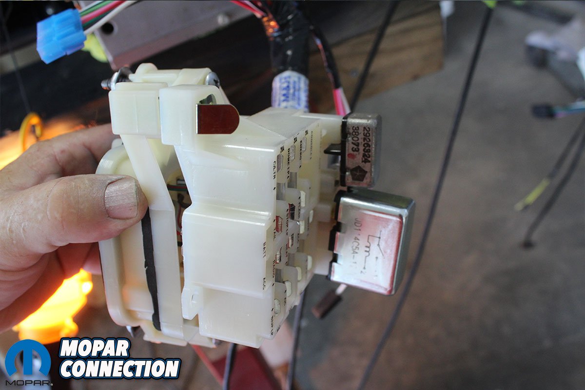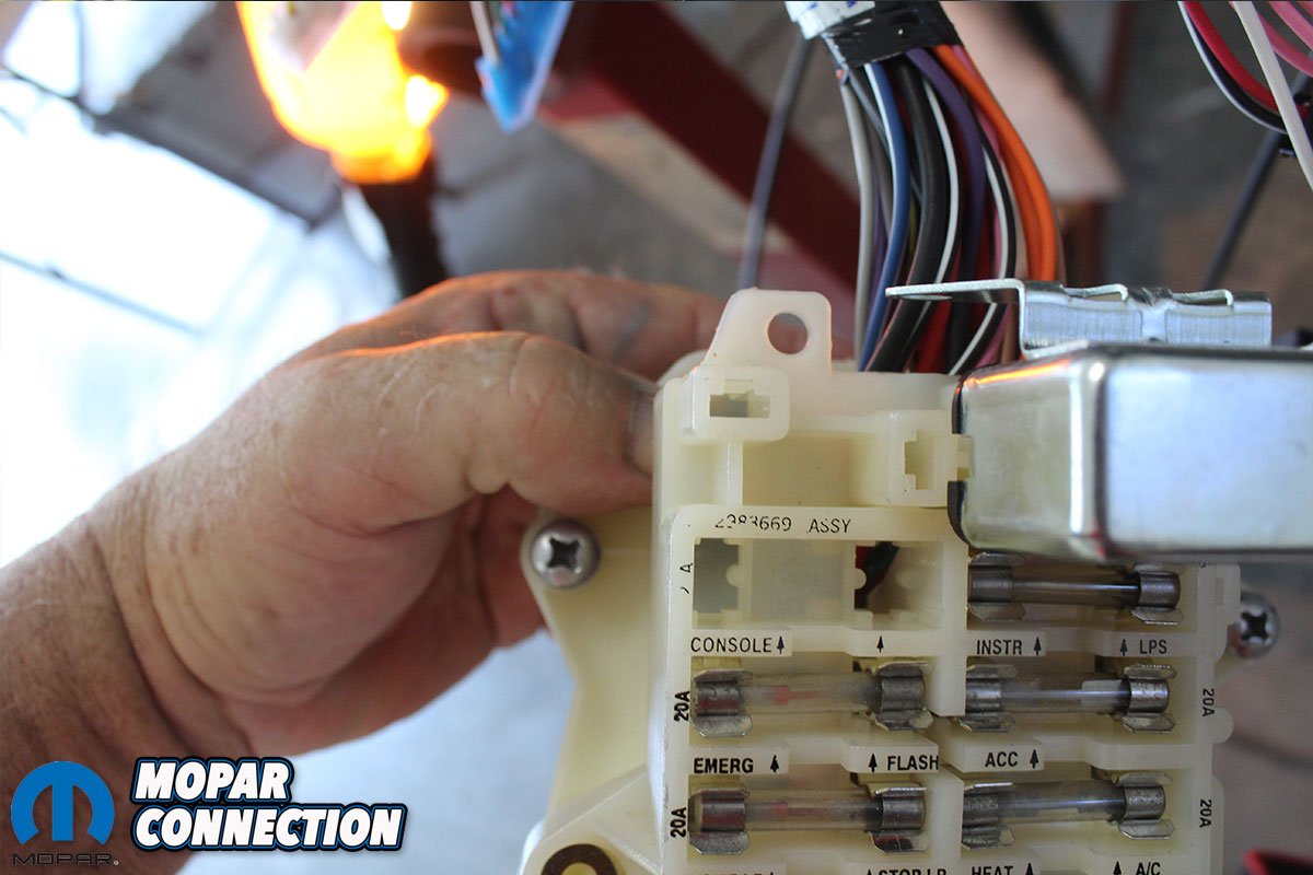 Above Left: While waiting on our missing parts, we replaced all of the fuses with new ones and attached the two-piece bulk-head connectors together. Above Right: Once the parts came in, we installed them in the correct position on the bulk-head connector. After all, what is a convertible if the top doesn’t drop?