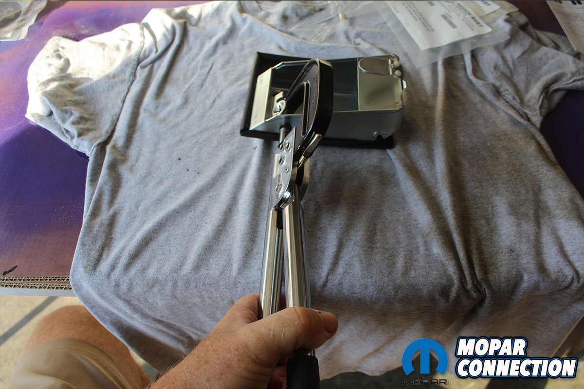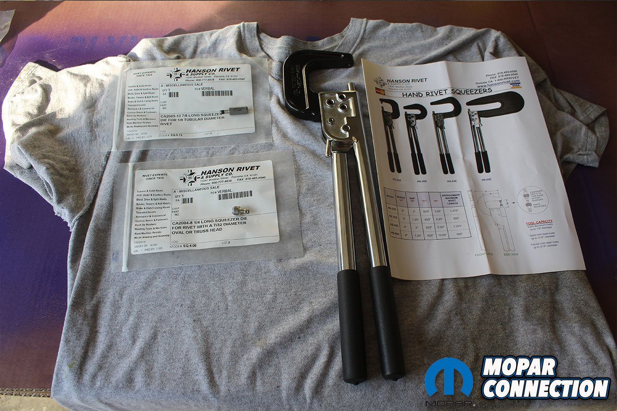 Above Left: For such a small piece, the ashtray assembly is a real challenge to restore. We purchased a replacement ashtray from Tony’s Parts. Since some people actually smoked in these cars, they are usually in poor shape. We already drilled out the rivets and removed the door from the tray. It was painted the same time as the dash so it will match exactly. The kit from Tony’s Parts comes with the special truss head rivets but with nothing to attach them correctly. We had to purchase from the correct Hand Rivet Squeezer from “Hanson’s Rivet and Supply” along with the 7/8 long squeezer die, and the ¼ long die for the oval or truss head rivets. This tool is the only way to get these unique rivets installed exactly like the originals. Above Right: The side rivet is a piece of cake to install and should be done first to hold the tray in place on the door. The head goes on the outside of the tray.