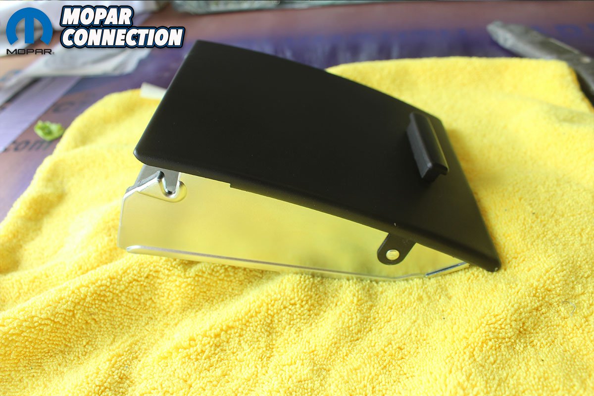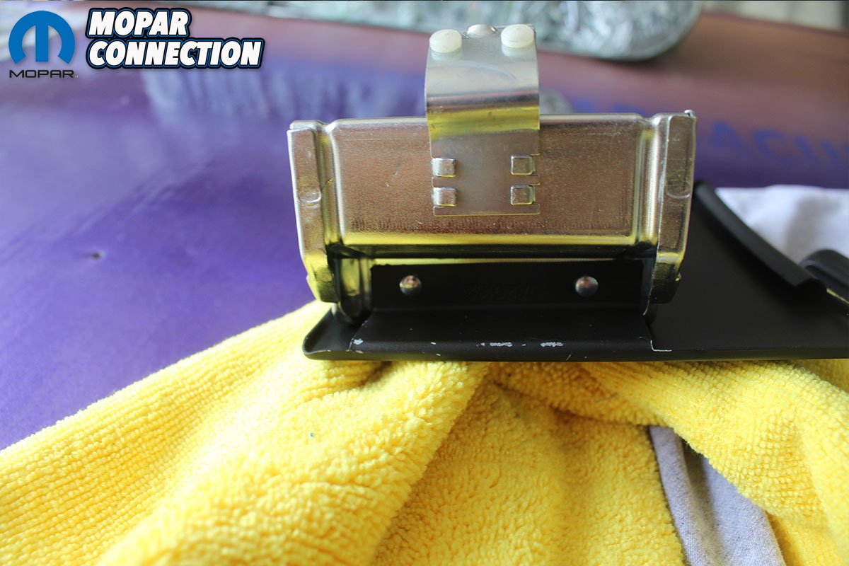 Above Left: Now you will have an exact ashtray and door to install into the dash. However, when we tried to test fit the ashtray, the tang was too loose to keep the door shut when closed. Above Right: When we went to slightly bend the tang, it snapped in half. After calling Tony’s Parts, they said that they had some of them break and that they would send another one, however it would be made with the same material as the one that failed. Since my original one was in really good shape, I just bent the 4 small tabs that attached the adjuster tang and attached my original. It is working great with no breakage. The frame that holds the ashtray and cigar lighter is painted semi- gloss black and is not the same finish as the suede black on the dash.