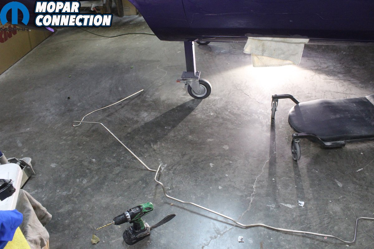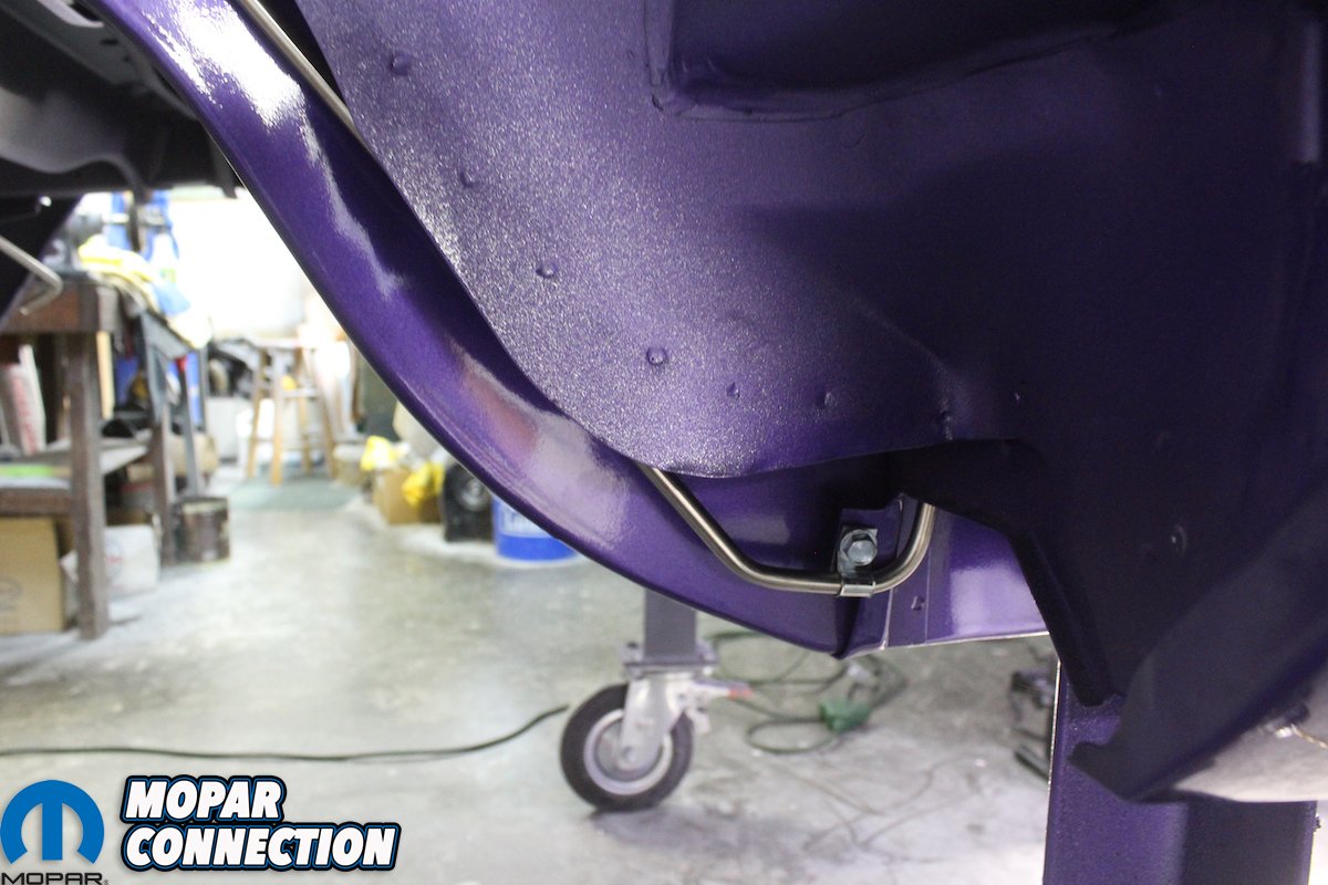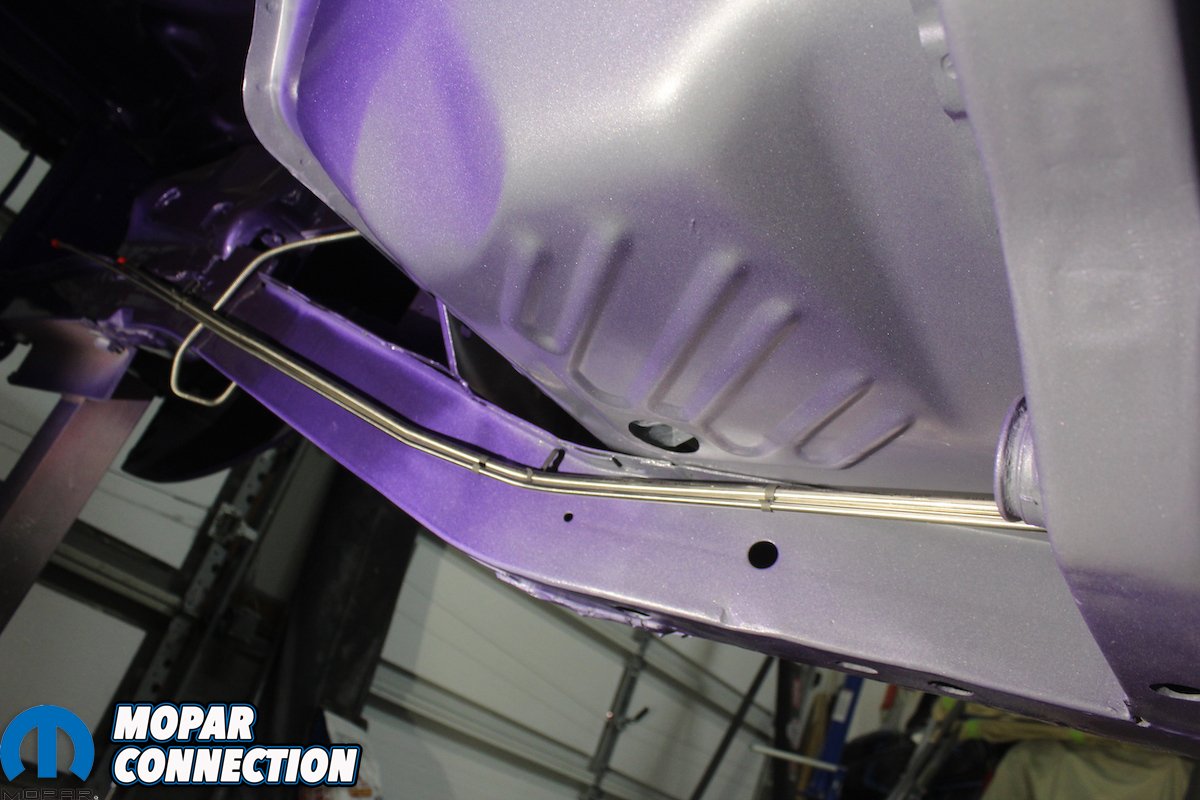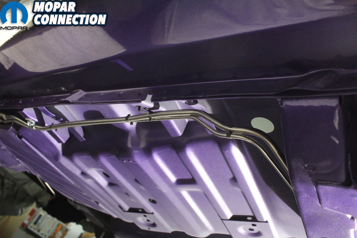 Above left: We take the bend out of the line that is required for shipping and install it from the rear towards the front of the car. It must be threaded through the torsion bar sub frame in the front. We then attach the fuel line to the frame using a clip and a bolt just before the rear wheel opening. Notice there isn’t any wheel well undercoating applied yet. It was shot after these lines were installed. Above right: The upper rear clip is then attached to the frame with the same style clip and self- threading bolt. The bend in the lines fits perfectly and it goes under the frame rail and then over to where it will attach to the fuel tank. Also notice the factory correct spot welds that AMD Installations used when they resurrected the Comeback ‘Cuda from the dead. You can’t duplicate these with a MIG welder.