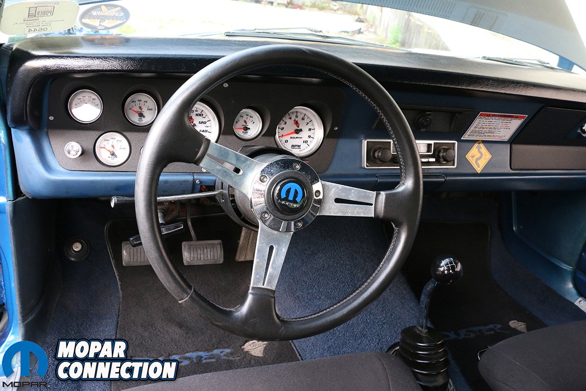 Above Left: Although much of the original interior is still present, Eric upgraded a few components to suit the Duster better. Above Right: For being a car that’s driven often, the engine bay is clean and everything has its own place.