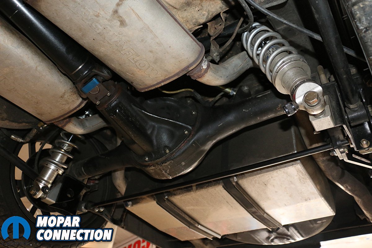 Above Left: The RMS Street-Lynx triangulated rear suspension is mounted to an 8 3/4″ with 3:73 gears and a Detroit Truetrac. You might notice the gas tank isn’t stock and is a a custom made unit that Eric had built to supply the F.A.S.T. fuel injection. Above Right: The 360 breathes through a set of Hooker Headers and the 26″ aluminum radiator and electric fan keeps the motor cool under any condition.