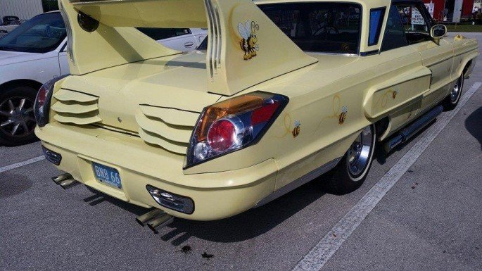 Alas the front. The poor, poor front. More re-purposed Nissan lighting is found up front grafted into a depressing Daytona-style nose and cobbled-together air dam. But because aerodynamics have nothing to do with this design, a goofy bumblebee hood ornament replaces the Plymouth piece. Obviously far too much money was spent on a project that could’ve been better spent benefiting children’s cancer research, relocating refugees from terrorist territories or rolled up tightly and crammed up the owner’s derriere.